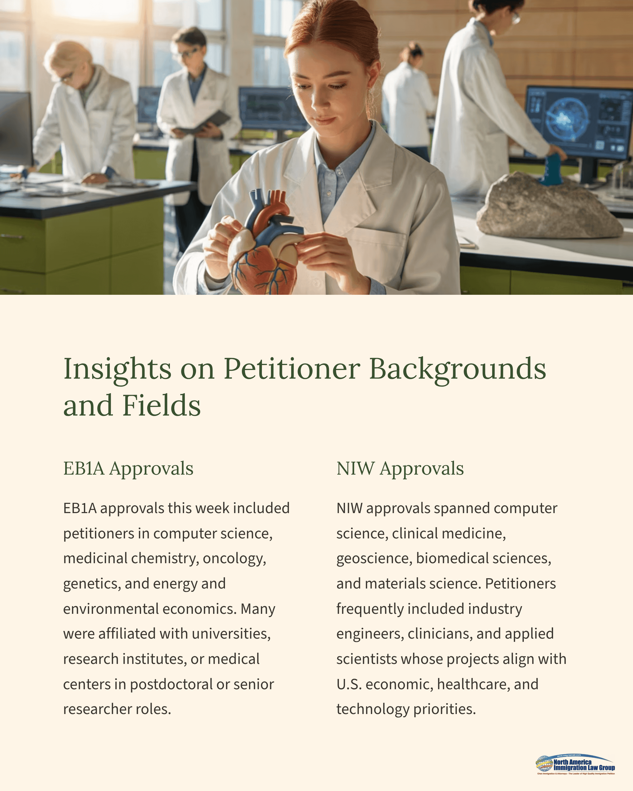 EB1A approvals this week included petitioners in computer science, medicinal chemistry, oncology, genetics, and energy and environmental economics. Many were affiliated with universities, research institutes, or medical centers in postdoctoral or senior researcher roles.NIW approvals spanned computer science, clinical medicine, geoscience, biomedical sciences, and materials science. Petitioners frequently included industry engineers, clinicians, and applied scientists whose projects align with U.S. economic, healthcare, and technology priorities.