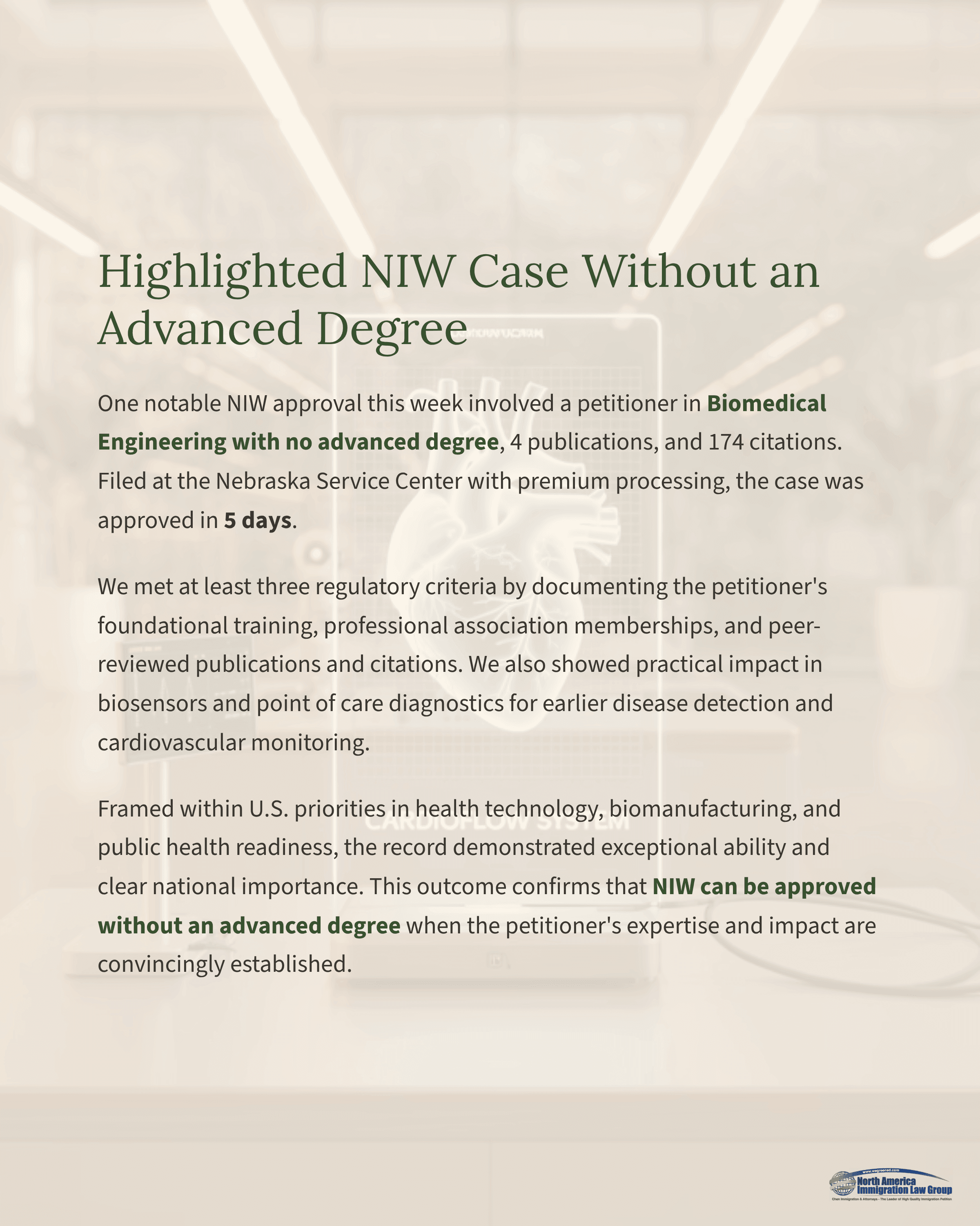 One notable NIW approval this week involved a petitioner in Biomedical Engineering who did not hold an advanced degree. The record reflected 4 publications and 174 citations, and the case was adjudicated at the Nebraska Service Center. The petition was filed with premium processing and was approved in 5 days. Our legal team crafted a compelling case under the exceptional ability standard, demonstrating expertise significantly above that ordinarily encountered in the field.We strategically selected evidence to satisfy at least three of the regulatory criteria, documenting the petitioner’s foundational training in biomedical engineering, membership in recognized professional associations, and peer recognition through publications and citations. We also emphasized the practical applications of the petitioner’s work in biosensors and point of care diagnostics, focusing on early disease detection and cardiovascular monitoring that deliver clear benefits for U.S. public health and healthcare sustainability.