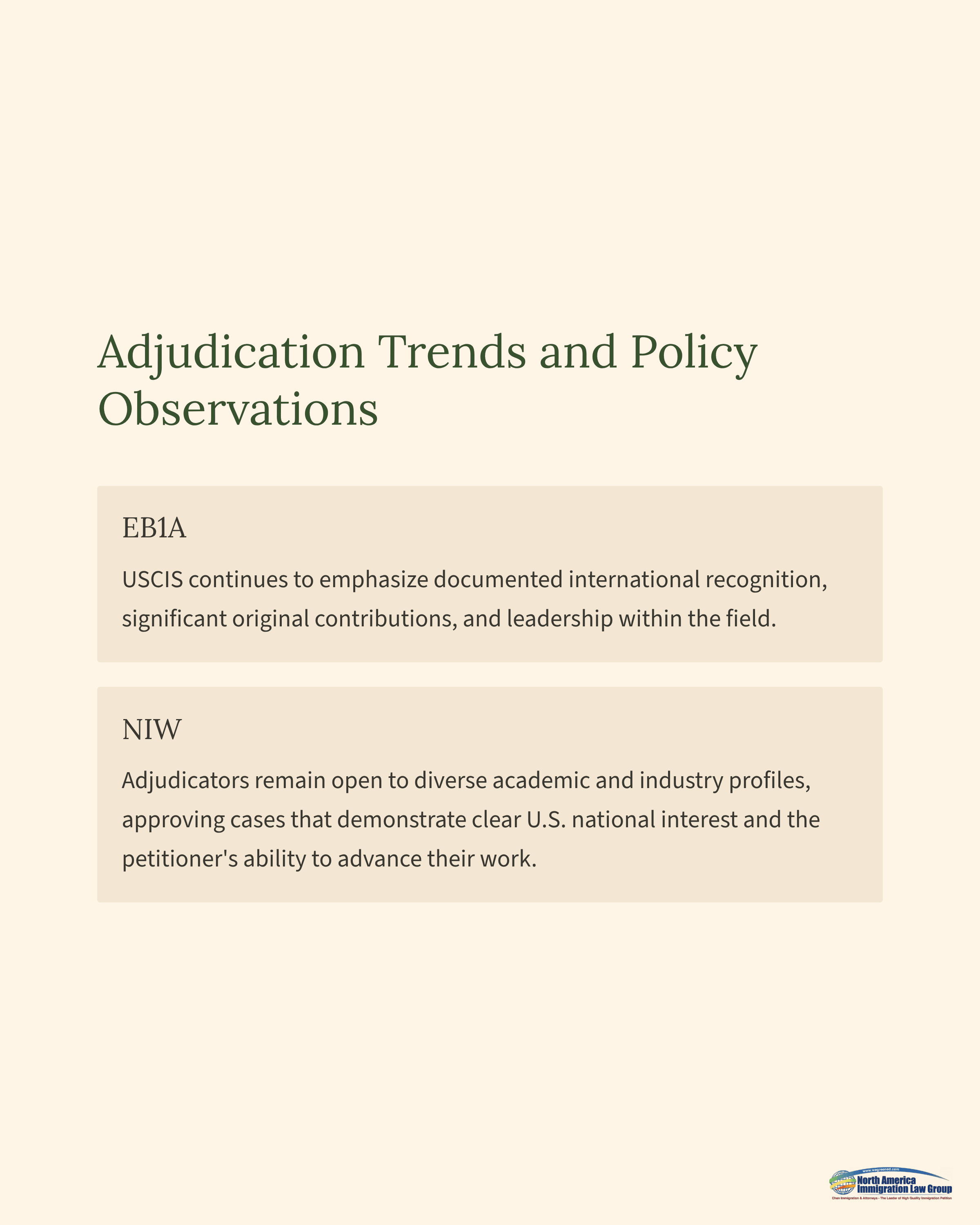 EB1A: USCIS continues to emphasize documented international recognition, significant original contributions, and leadership within the field.NIW: Adjudicators remain open to diverse academic and industry profiles, approving cases that demonstrate clear U.S. national interest and the petitioner’s ability to advance their work.