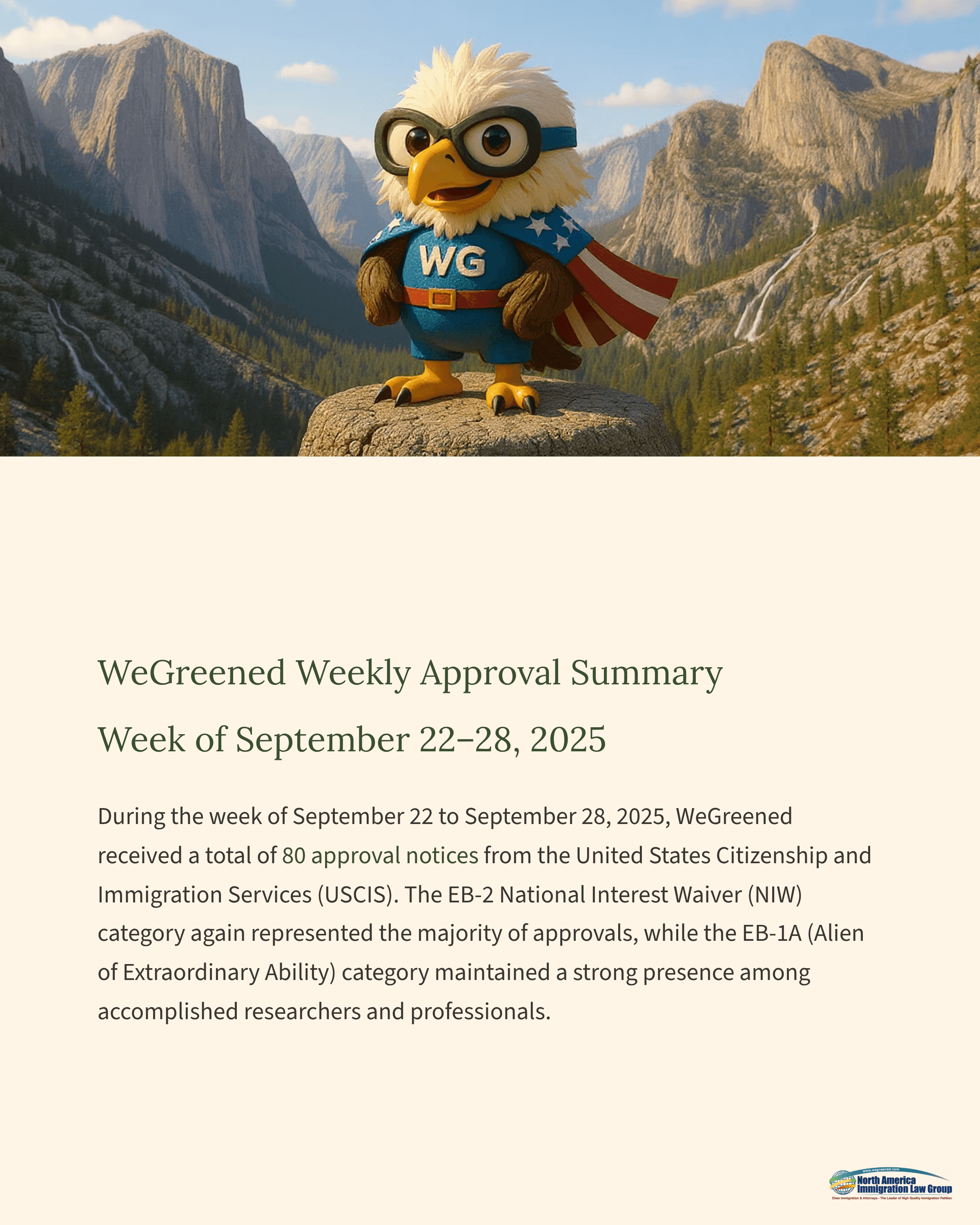 During the week of September 22 to September 28, 2025, WeGreened received a total of 80 approval notices from the United States Citizenship and Immigration Services (USCIS). The EB-2 National Interest Waiver (NIW) category again represented the majority of approvals, while the EB-1A (Alien of Extraordinary Ability) category maintained a strong presence among accomplished researchers and professionals.