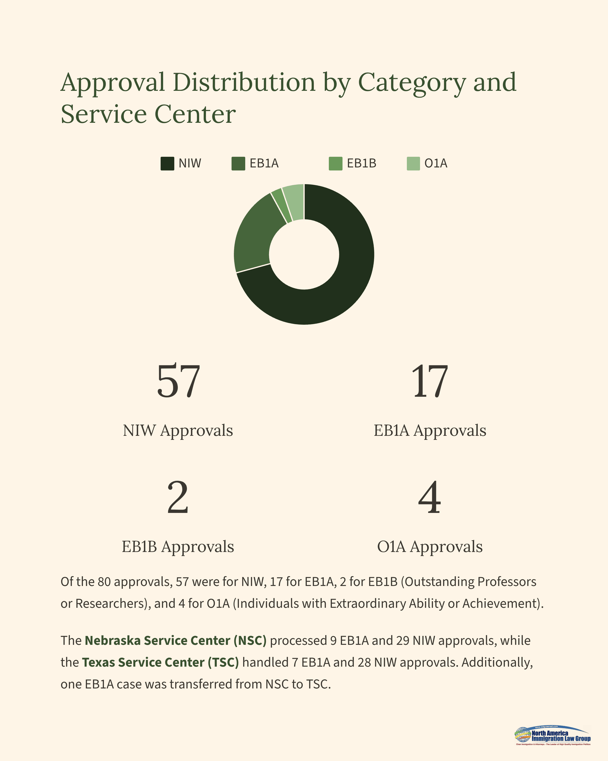 Of the 80 approvals, 57 were for NIW, 17 for EB1A, 2 for EB1B (Outstanding Professors or Researchers), and 4 for O1A (Individuals with Extraordinary Ability or Achievement).The Nebraska Service Center (NSC) processed 9 EB1A and 29 NIW approvals, while the Texas Service Center (TSC) handled 7 EB1A and 28 NIW approvals. Additionally, one EB1A case was transferred from NSC to TSC.