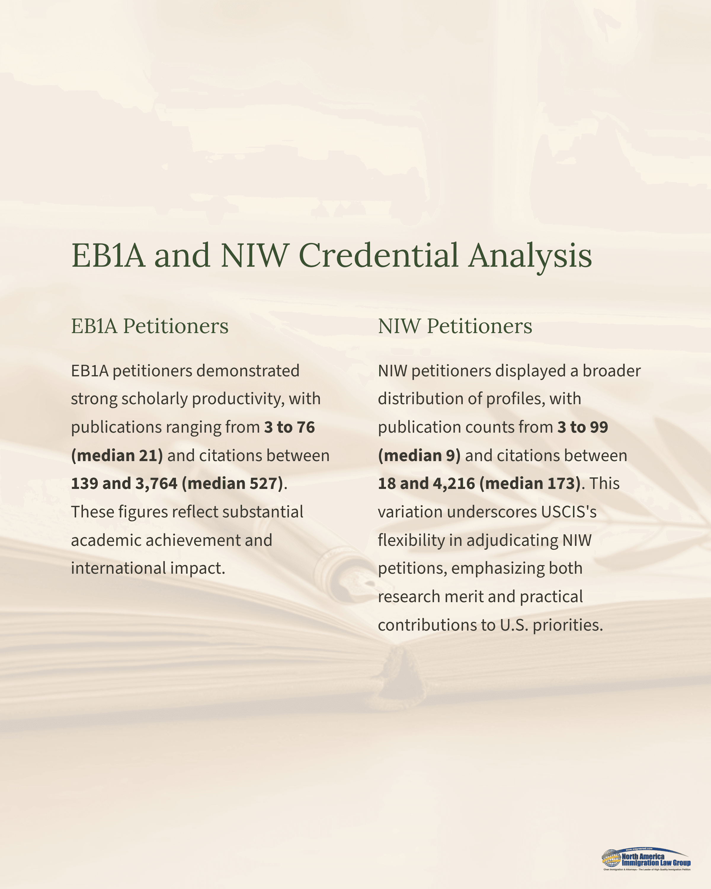 EB1A petitioners demonstrated strong scholarly productivity, with publications ranging from 3 to 76 (median 21) and citations between 139 and 3,764 (median 527). These figures reflect substantial academic achievement and international impact.NIW petitioners displayed a broader distribution of profiles, with publication counts from 3 to 99 (median 9) and citations between 18 and 4,216 (median 173). This variation underscores USCIS’s flexibility in adjudicating NIW petitions, emphasizing both research merit and practical contributions to U.S. priorities.