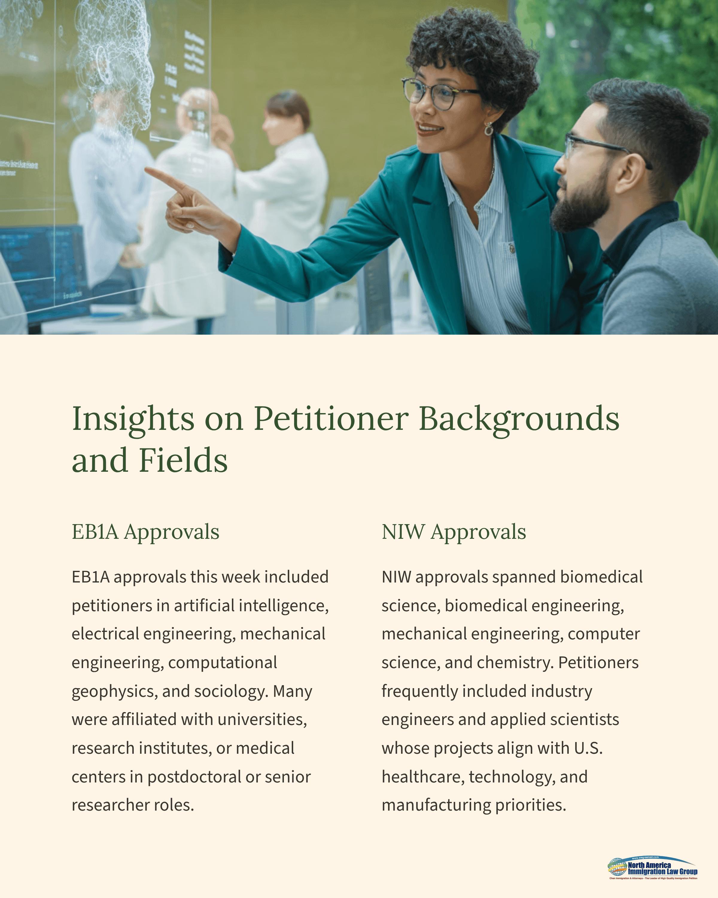 EB1A approvals this week included petitioners in artificial intelligence, electrical engineering, mechanical engineering, computational geophysics, and sociology. Many were affiliated with universities, research institutes, or medical centers in postdoctoral or senior researcher roles.NIW approvals spanned biomedical science, biomedical engineering, mechanical engineering, computer science, and chemistry. Petitioners frequently included industry engineers and applied scientists whose projects align with U.S. healthcare, technology, and manufacturing priorities.