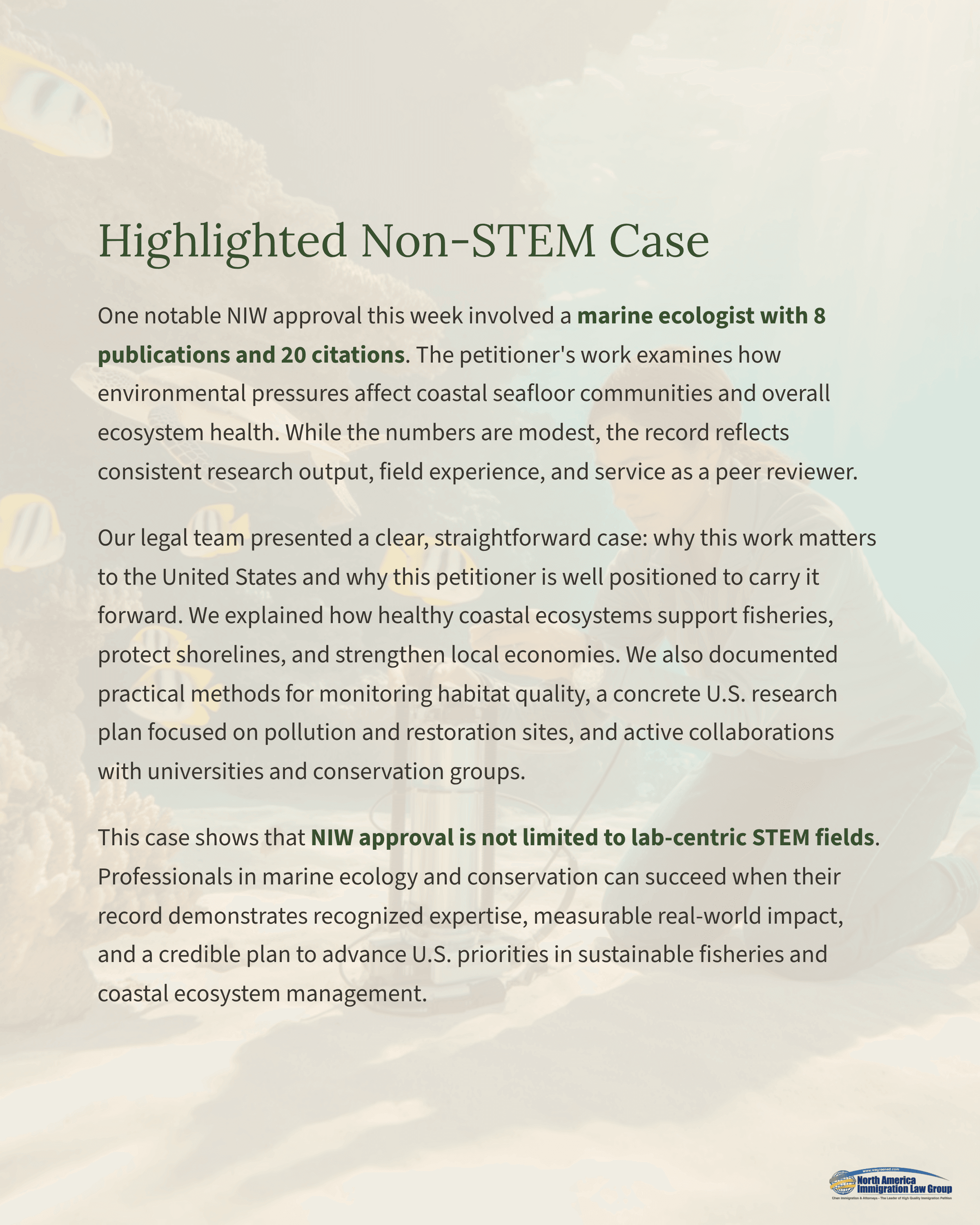 One notable NIW approval this week involved a marine ecologist with 8 publications and 20 citations. The petitioner’s work examines how environmental pressures affect coastal seafloor communities and overall ecosystem health. While the numbers are modest, the record reflects consistent research output, field experience, and service as a peer reviewer.Our legal team presented a clear, straightforward case: why this work matters to the United States and why this petitioner is well-positioned to carry it forward. We explained how healthy coastal ecosystems support fisheries, protect shorelines, and strengthen local economies. We also documented practical methods for monitoring habitat quality, a concrete U.S. research plan focused on pollution and restoration sites, and active collaborations with universities and conservation groups.
