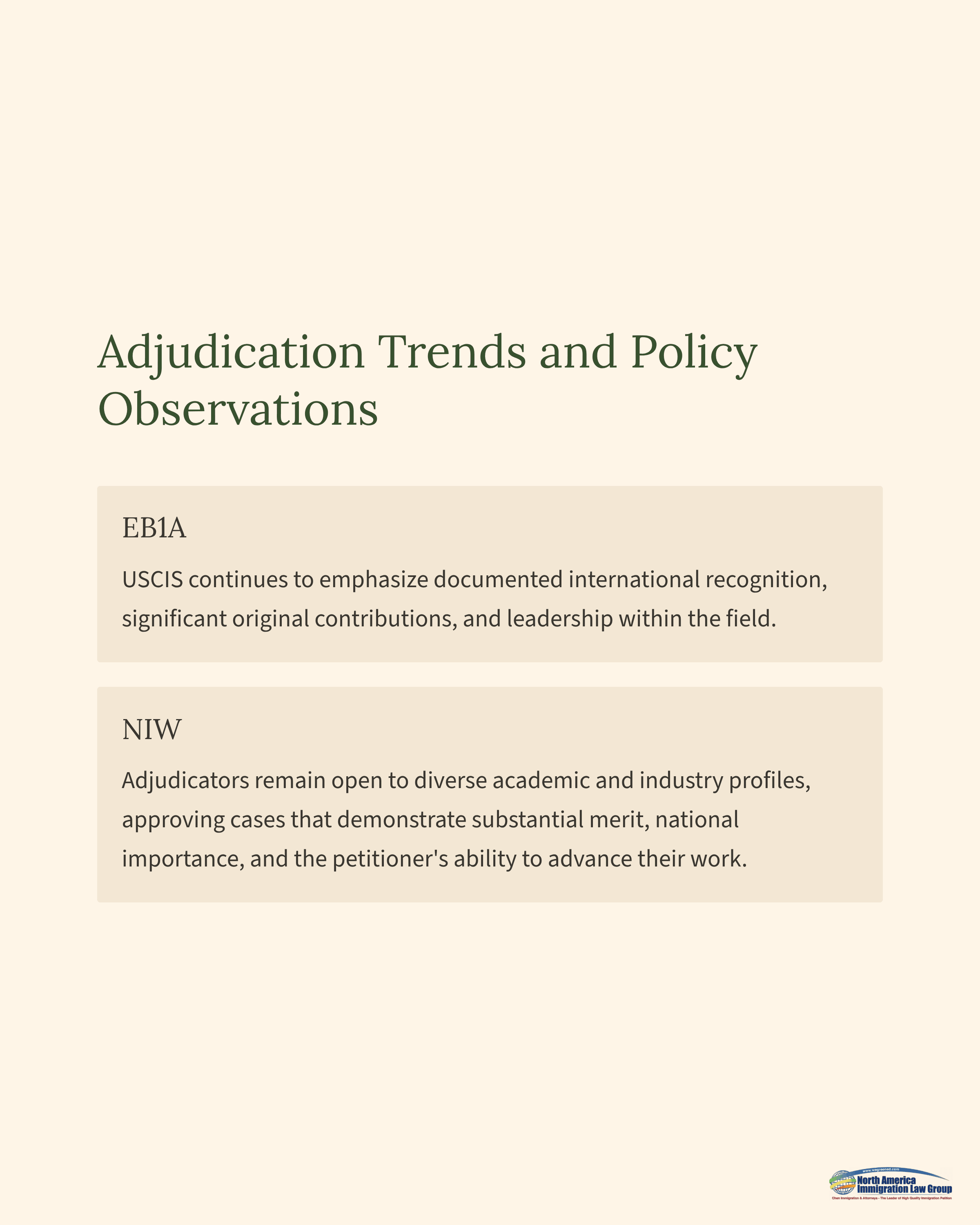 EB1A: USCIS continues to emphasize documented international recognition, significant original contributions, and leadership within the field.NIW: Adjudicators remain open to diverse academic and industry profiles, approving cases that demonstrate substantial merit, national importance, and the petitioner’s ability to advance their work.