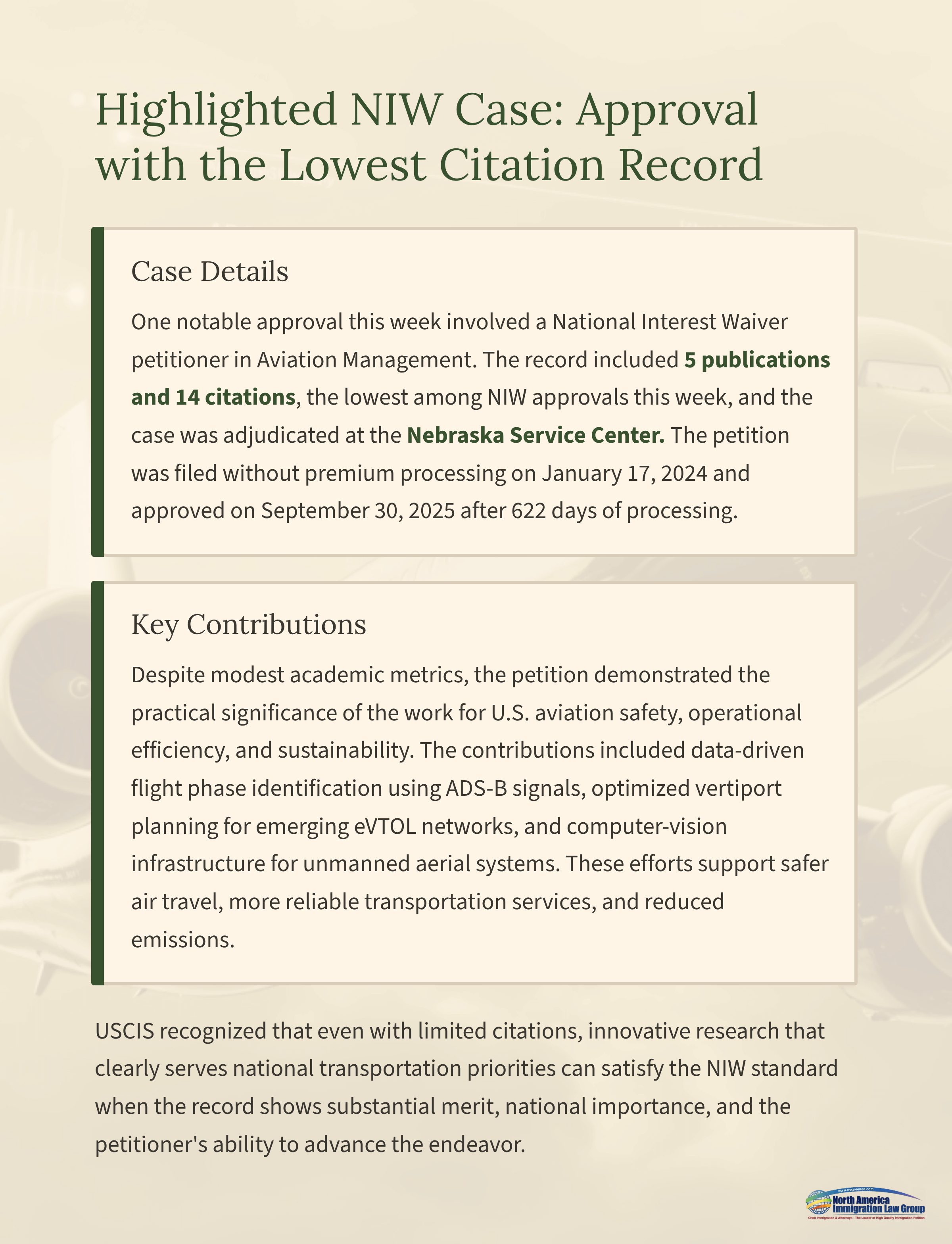 One notable approval this week involved a National Interest Waiver petitioner in Aviation Management. The record included 5 publications and 14 citations, the lowest among NIW approvals this week, and the case was adjudicated at the Nebraska Service Center. The petition was filed without premium processing on January 17, 2024 and approved on September 30, 2025 after 622 days of processing.