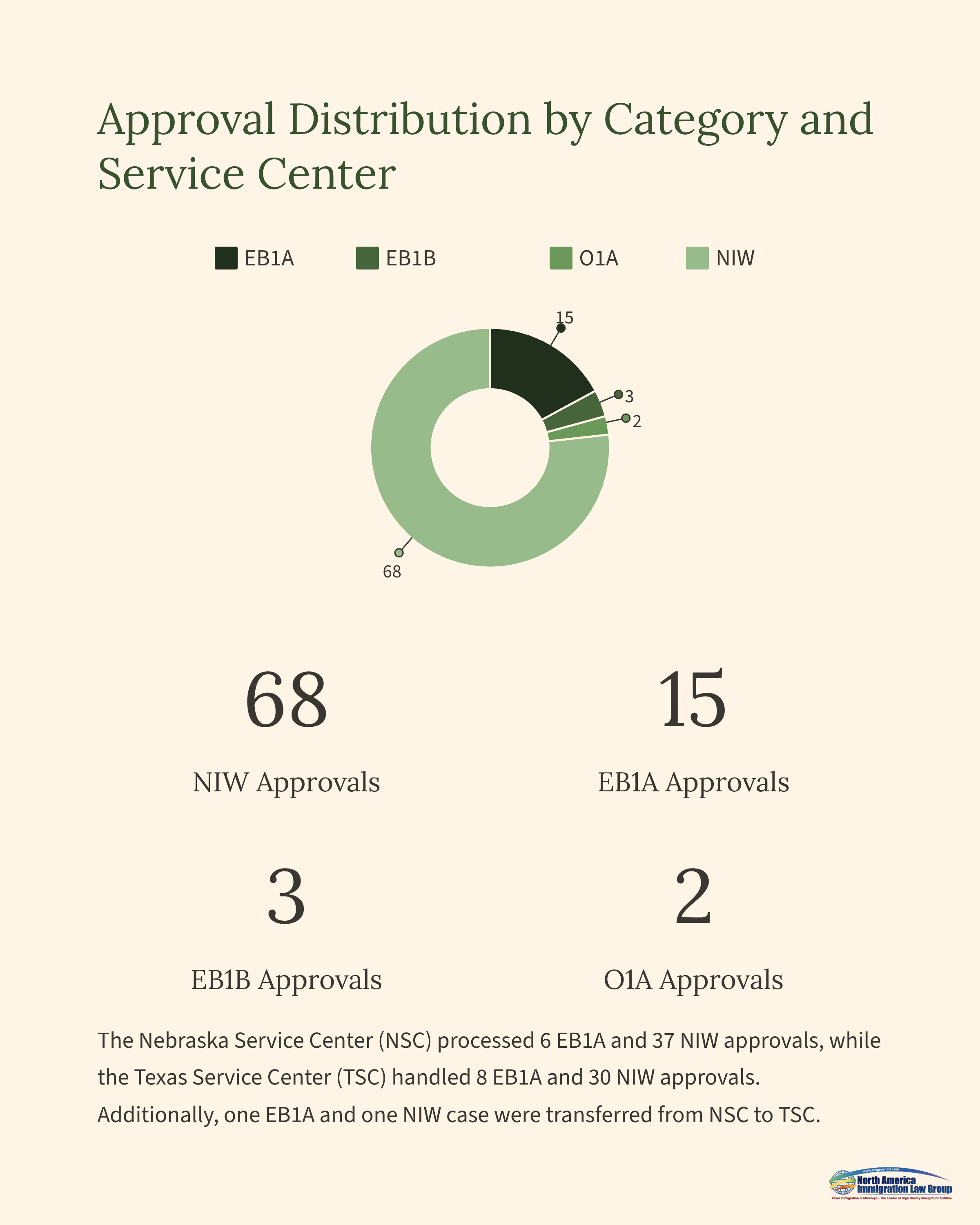 The Nebraska Service Center (NSC) processed 6 EB1A and 37 NIW approvals, while the Texas Service Center (TSC) handled 8 EB1A and 30 NIW approvals. Additionally, one EB1A and one NIW case were transferred from NSC to TSC.