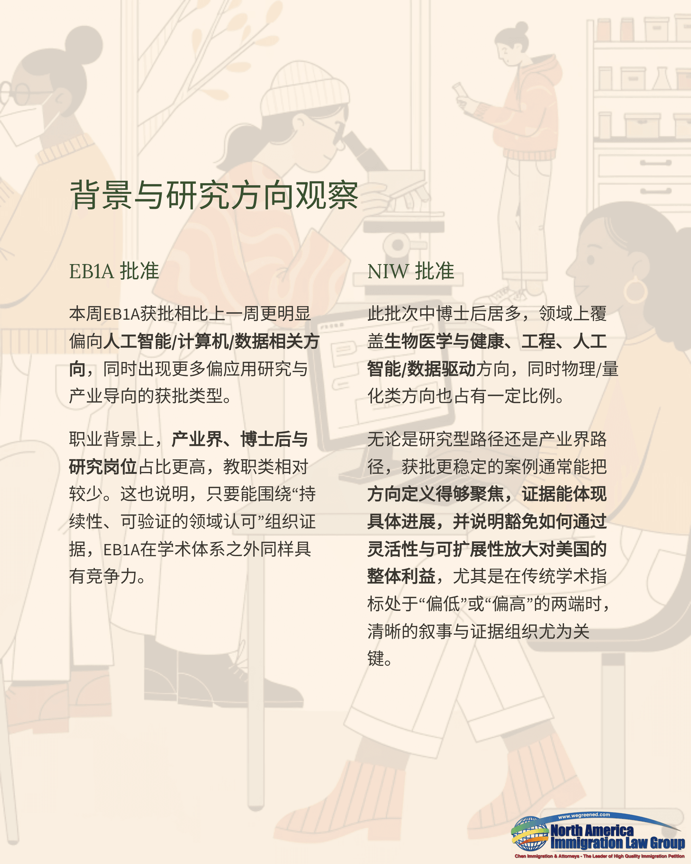 本周NIW获批呈现“博士后占比更高”的特点,领域上覆盖生物医学与健康、工程、AI/数据驱动方向,同时物理/量化类方向也占有一定比例。无论是研究型路径还是产业界路径,获批更稳定的案例通常能把方向定义得够聚焦,证据能体现具体进展,并说明豁免如何通过灵活性与可扩展性放大对美国的整体利益,尤其是在传统学术指标处于“偏低”或“偏高”的两端时,清晰的叙事与证据组织尤为关键。