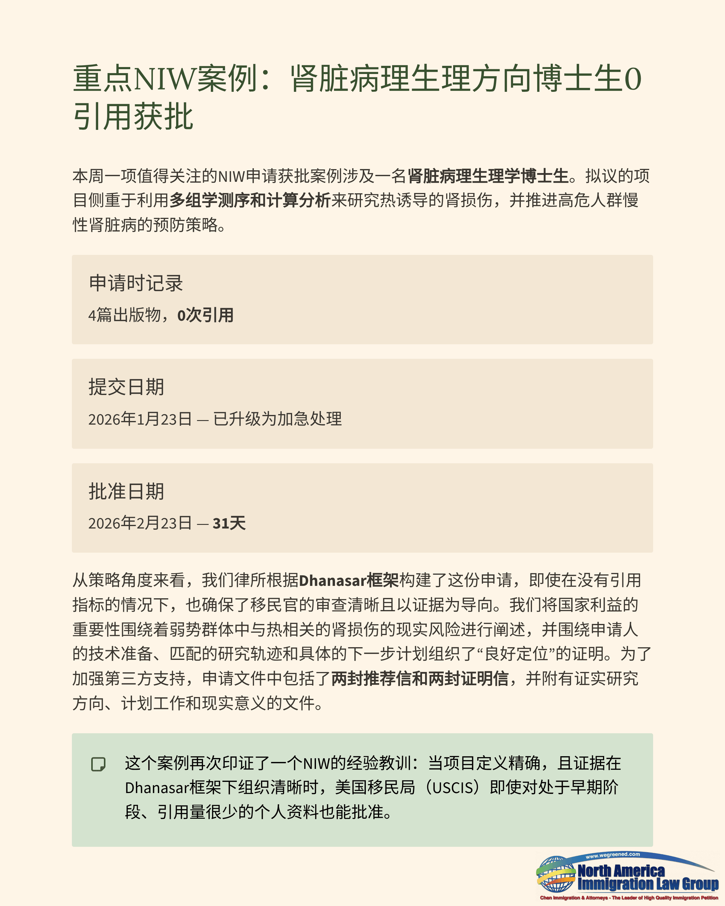 在策略上,我们以Dhanasar框架为主线,即便没有引用指标,也让移民官的审阅过程保持清晰、以证据为核心。我们从现实风险切入“国家重要性”,强调高温相关肾损伤对脆弱人群的实际影响,并在“具备推进能力”部分围绕技术准备度、研究方向的一致性,以及明确的下一步计划进行组织。为加强第三方支持,本案配备两封推荐信与两封佐证信(testimonial letters),并结合客观材料佐证研究方向、计划工作与现实相关性,帮助移民官从“工作内容与推进路径”而非“引用数字”来评估案件。