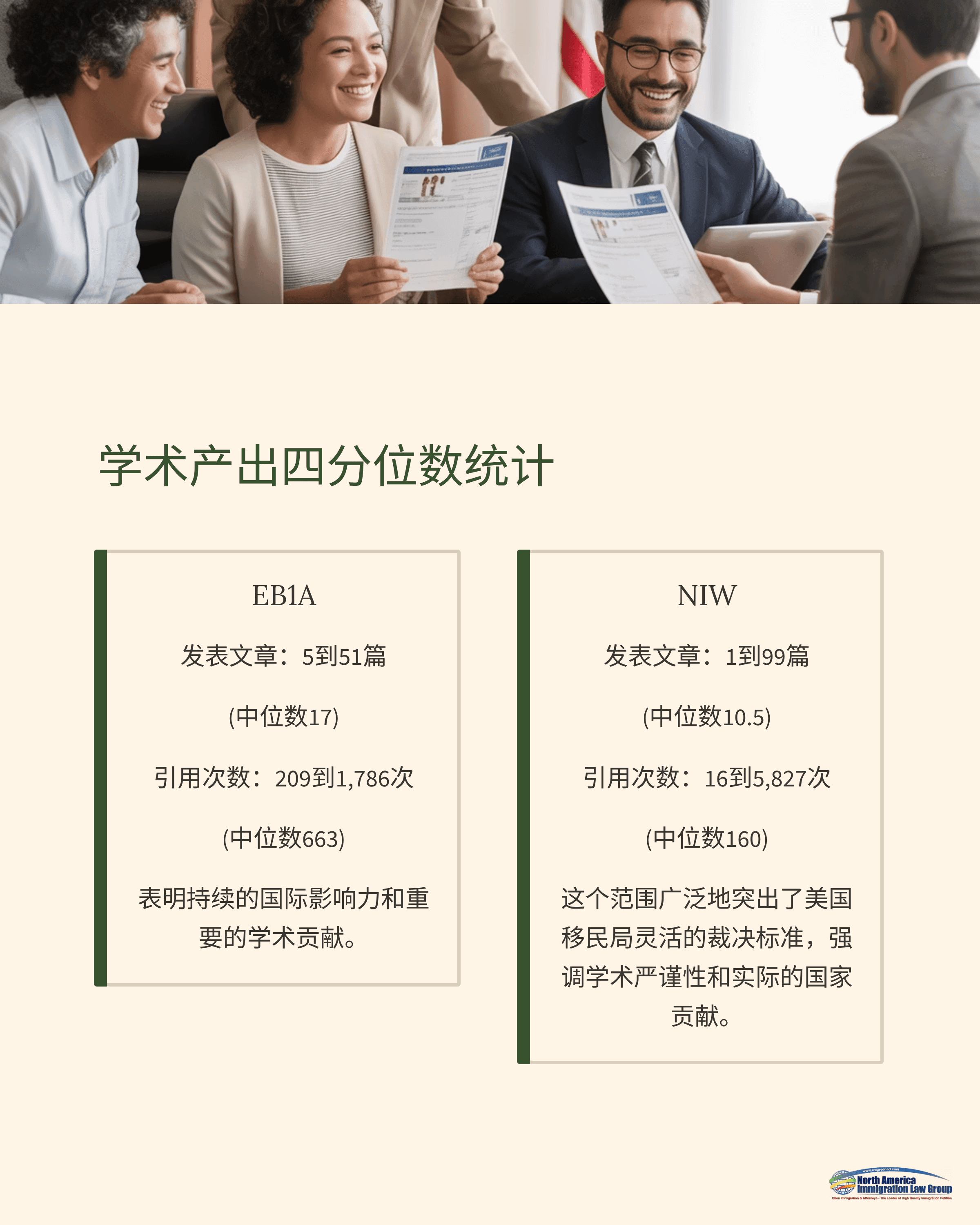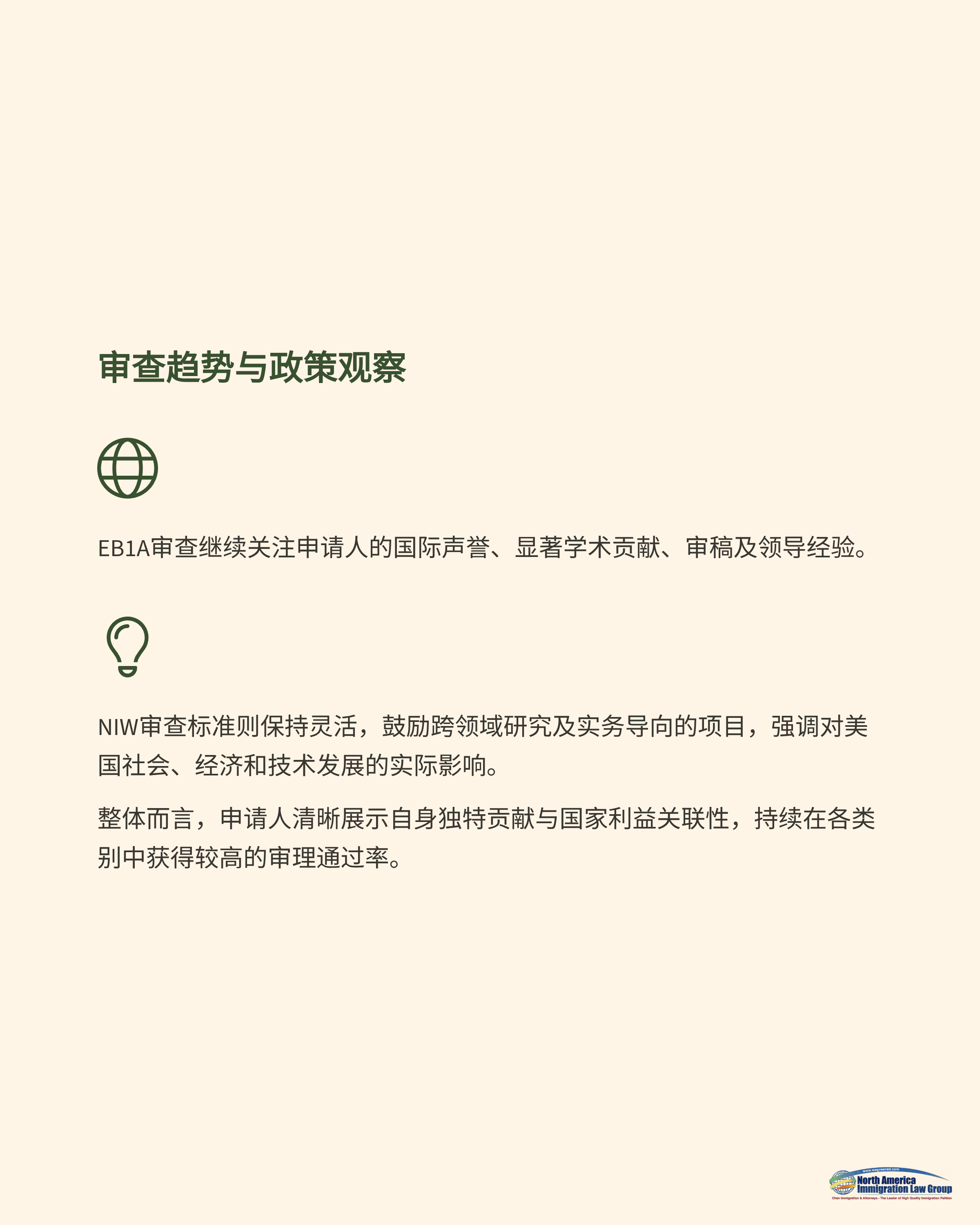 EB1A审查继续关注申请人的国际声誉、显著学术贡献、审稿及领导经验。NIW审查标准则保持灵活,鼓励跨领域研究及实务导向的项目,强调对美国社会、经济和技术发展的实际影响。