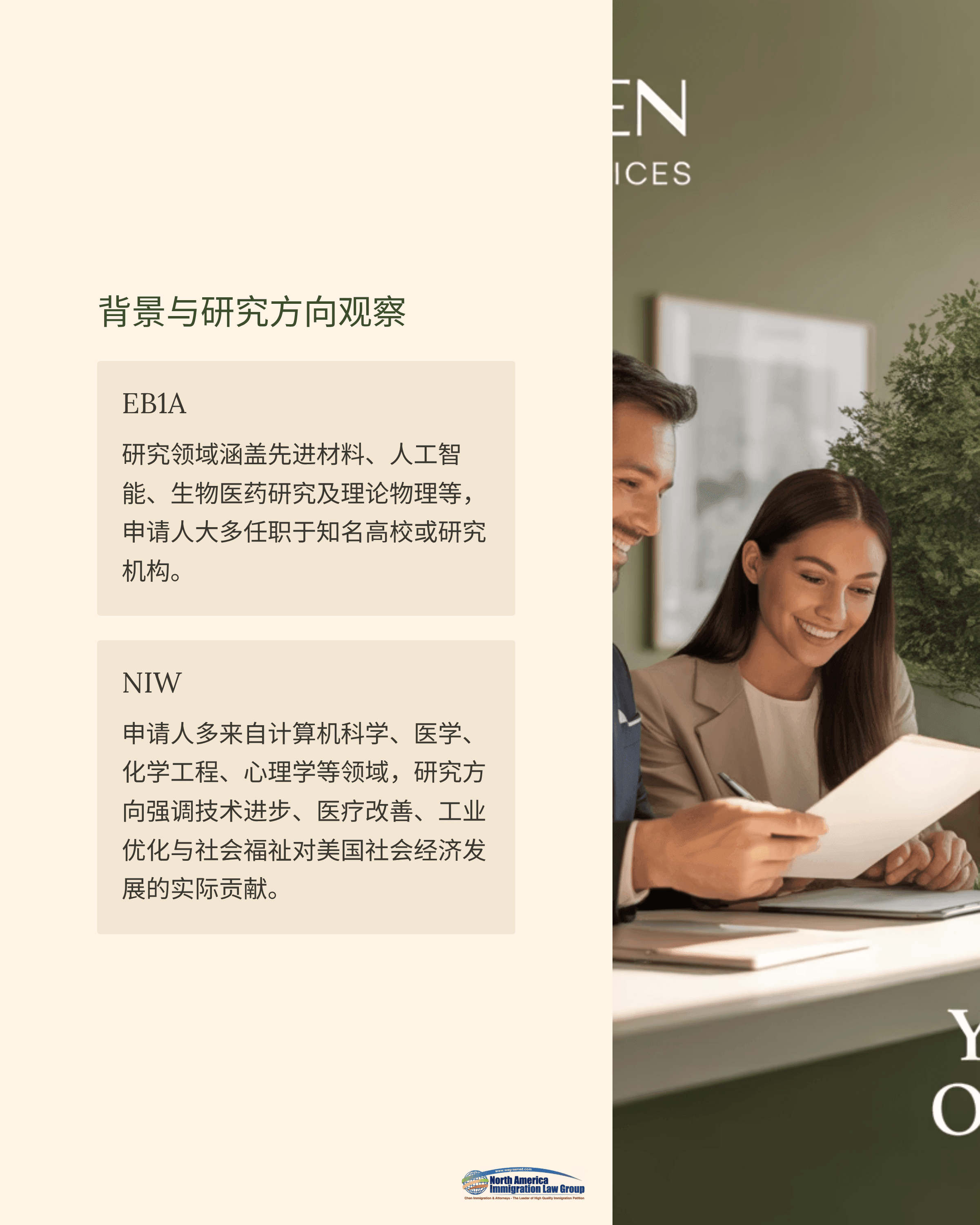 NIW: 申请人多来自计算机科学、医学、化学工程、心理学等领域,研究方向强调技术进步、医疗改善、工业优化与社会福祉对美国社会经济发展的实际贡献。