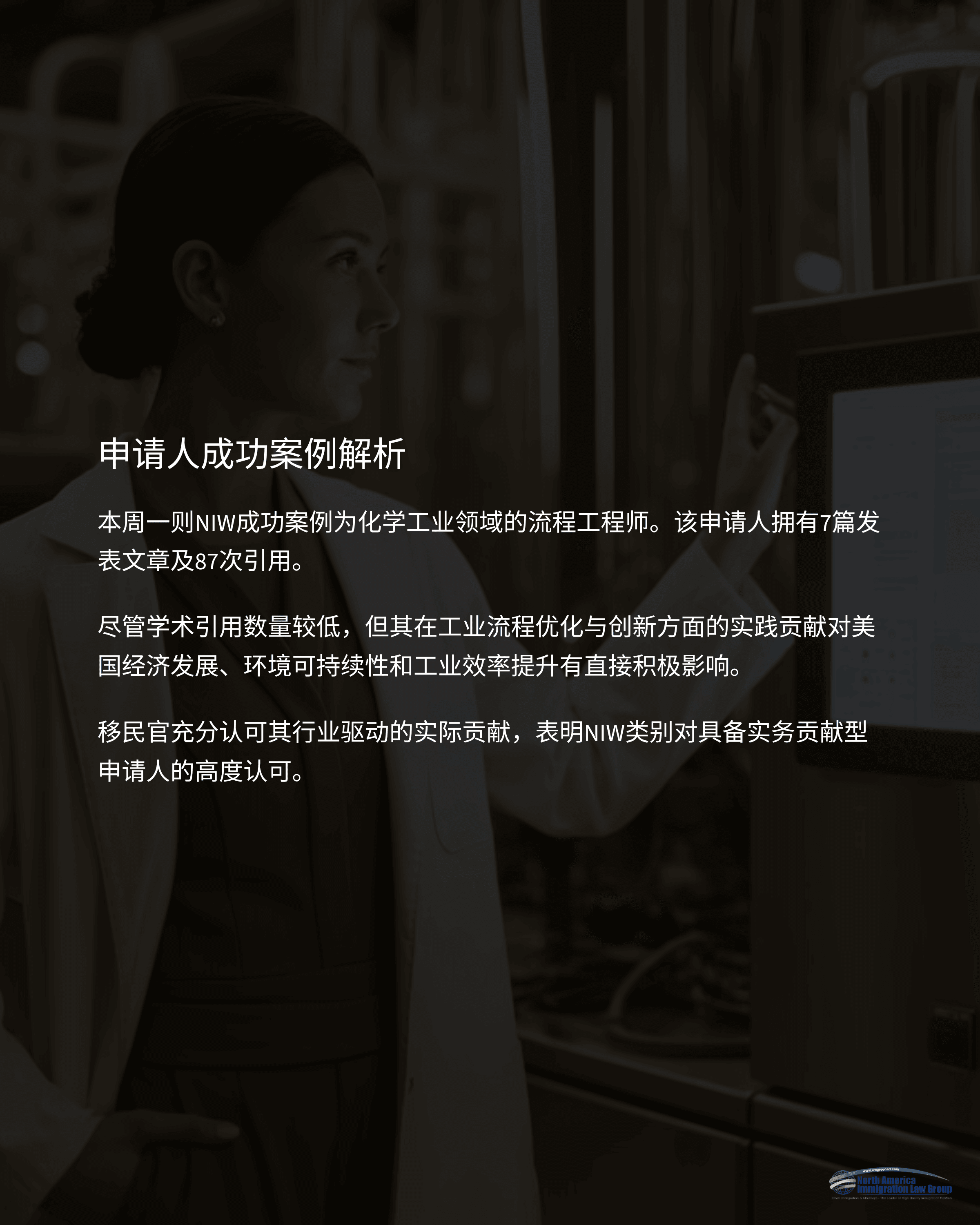 本周一则NIW成功案例为化学工业领域的流程工程师。该申请人拥有7篇发表文章及87次引用,尽管学术引用数量较低,但其在工业流程优化与创新方面的实践贡献对美国经济发展、环境可持续性和工业效率提升有直接积极影响。移民官充分认可其行业驱动的实际贡献,表明NIW类别对具备实务贡献型申请人的高度认可。