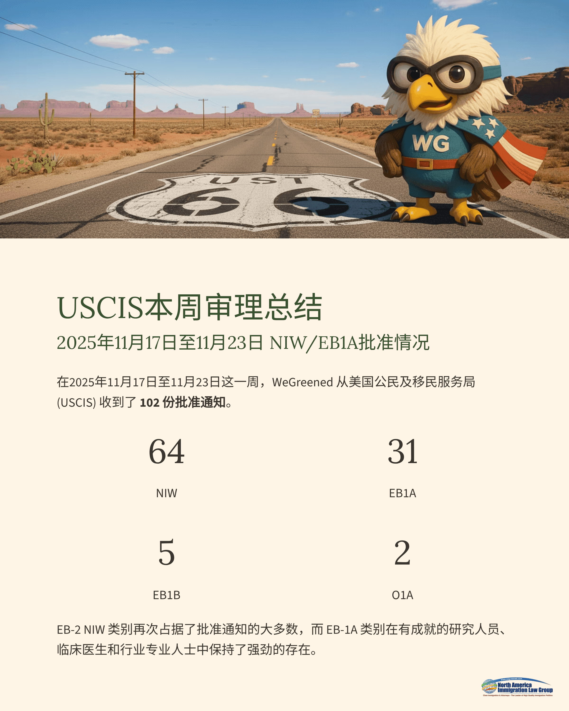 在2025年11月17日至2025年11月23日这一周内,WeGreened 共收到来自美国移民局(USCIS)的102份批准通知书。其中,NIW(国家利益豁免)64件、EB1A(杰出人才)31件、EB1B(杰出教授/研究人员)5件、O1A(杰出才能个人)2件。