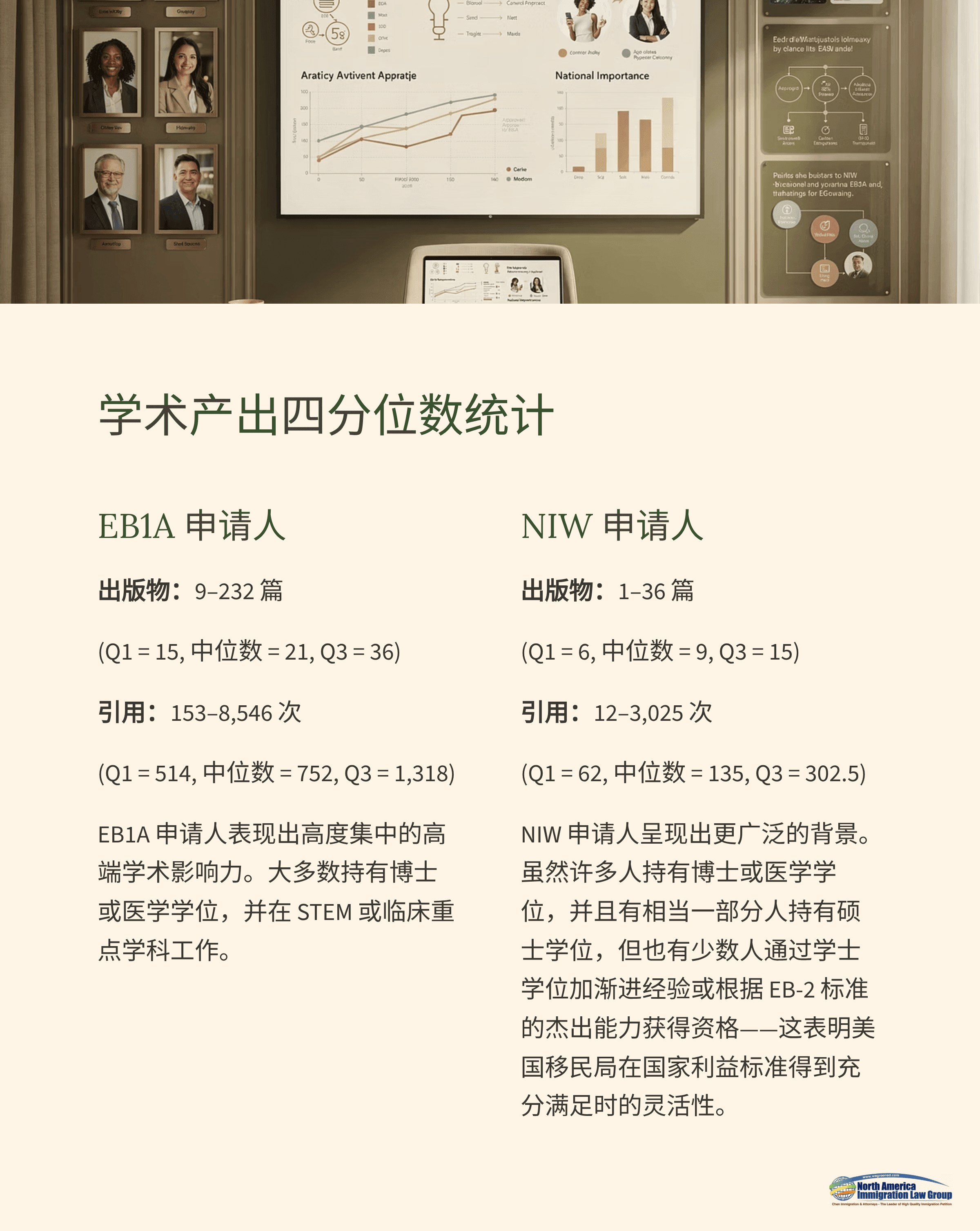 以上数据表明:EB1A申请人的发表与引用整体水平更高且更集中,体现出较强的学术影响力与国际同行认可;NIW的分布则更为宽泛,反映出USCIS在评估“实质性价值”和“国家重要性”时,对处于不同职业阶段、兼具学术与产业背景的申请人保持较高弹性与包容,即使引用量低于典型EB1A水平,只要整体记录能够支持国家利益维度,仍有机会获得批准。
