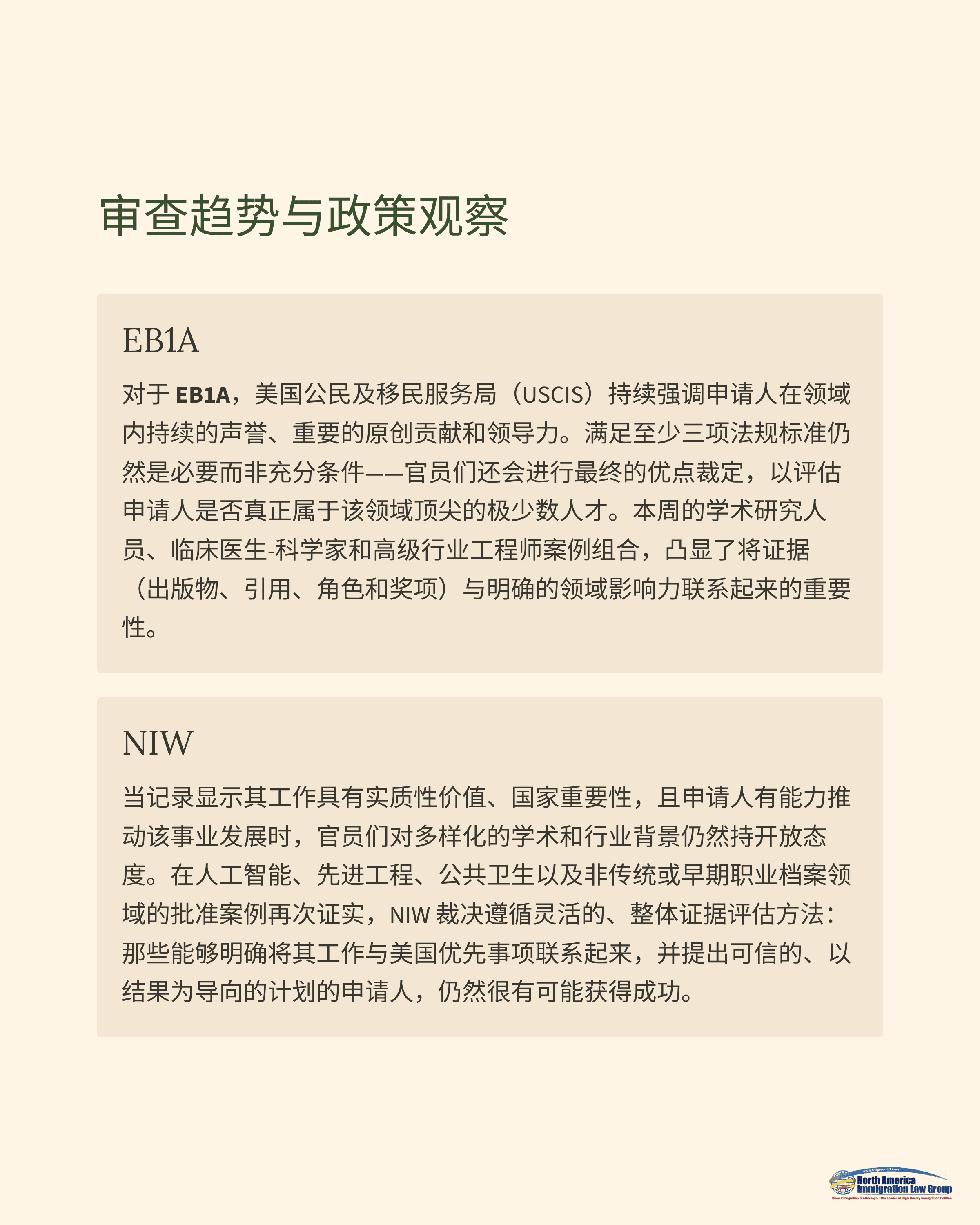 在NIW方面,USCIS继续对多元学术与产业背景保持开放态度,只要记录能够充分支持Dhanasar的三项标准:其一,拟推进的事业具有实质性价值并关乎国家重要性;其二,申请人通过既往成就、同行认可与在美规划,证明自己“有能力推进该事业”;其三,从整体权衡来看,豁免工作邀请与劳工证要求,对美国更具整体利益。本周在AI、先进工程、公共卫生以及若干“非典型”或早期职业背景上的获批结果,再次表明:NIW审查采纳的是灵活、整体性的证据标准。只要申请人能够将自身工作清晰对接美国长期优先目标,并提交可信、结果导向的推进计划,即便与同领域主流履历有所不同,仍有机会在审理中取得成功。