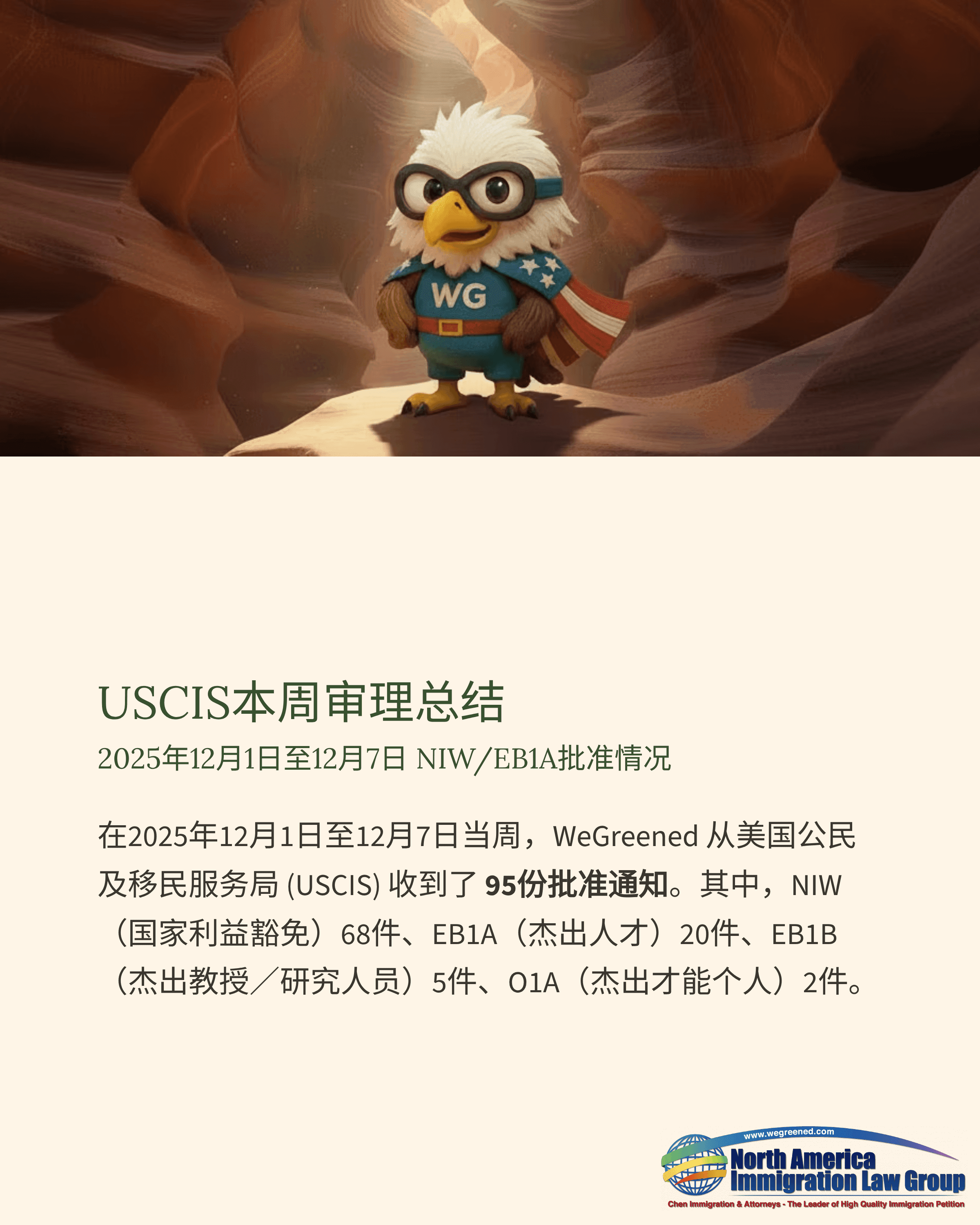在2025年12月1日至2025年12月7日这一周内,WeGreened 共收到来自美国移民局(USCIS)的95份批准通知书。其中,NIW(国家利益豁免)68件、EB1A(杰出人才)20件、EB1B(杰出教授/研究人员)5件、O1A(杰出才能个人)2件。