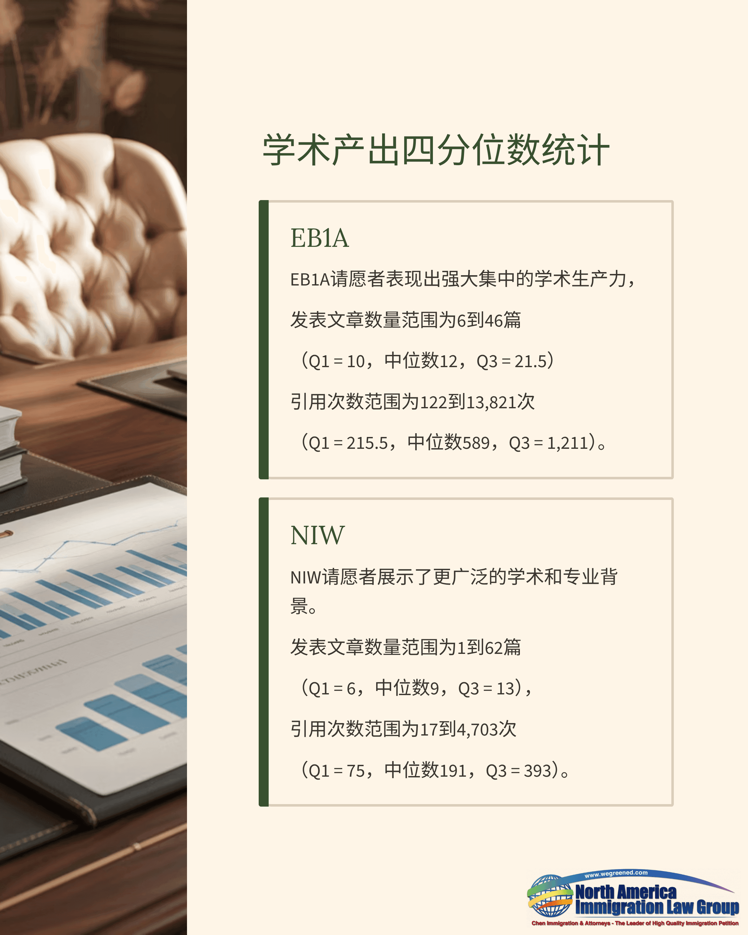 以上数据表明:EB1A申请人的发表与引用整体水平更高且更集中,体现出较强的学术影响力与国际同行认可;NIW的分布则更为宽泛,反映出USCIS在评估“实质性价值”和“国家重要性”时,对处于不同职业阶段、兼具学术与产业背景的申请人保持较高弹性与包容,即使引用量低于典型EB1A水平,只要整体记录能够支持国家利益维度,仍有机会获得批准。