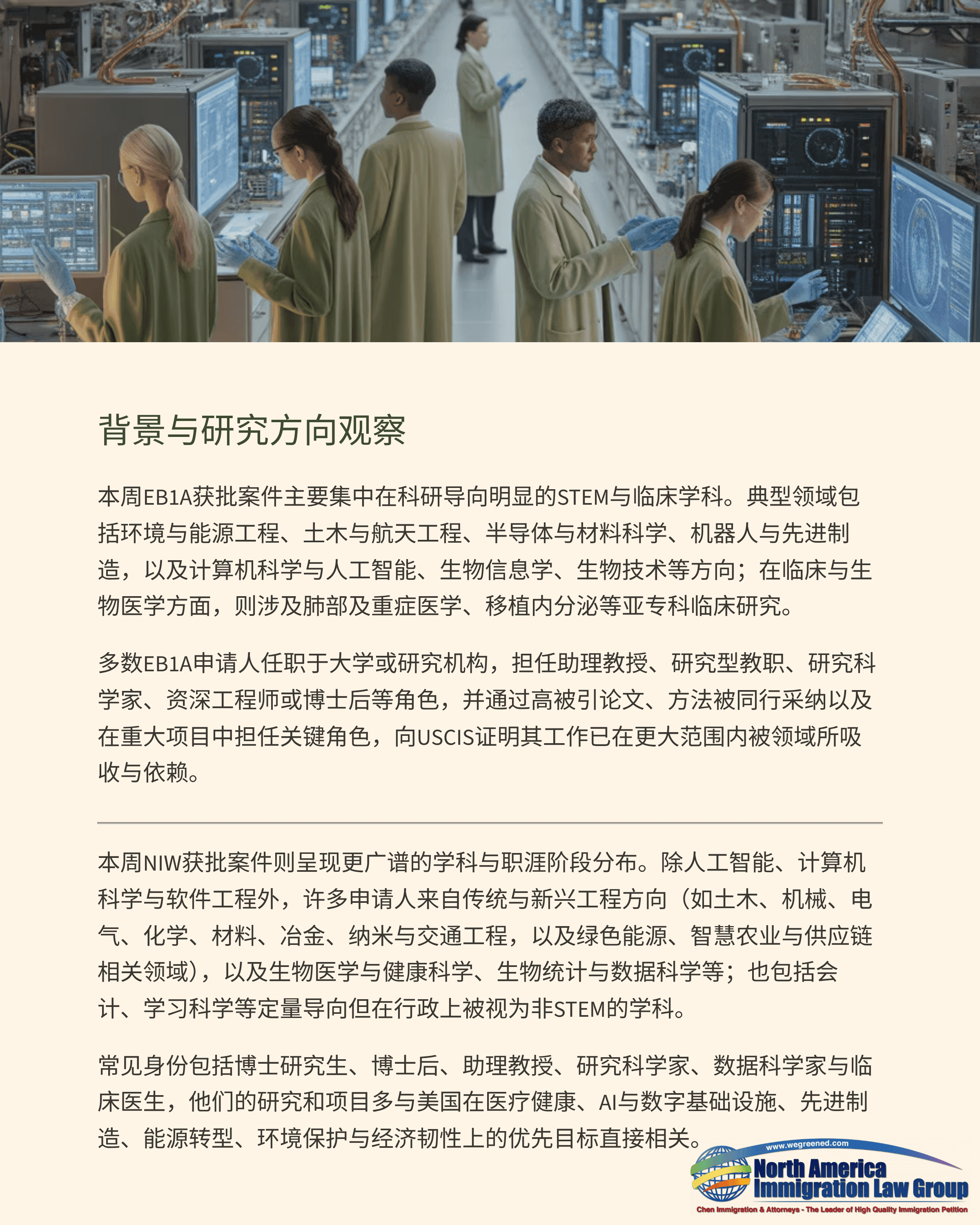 本周NIW获批案件则呈现更广谱的学科与职涯阶段分布。除人工智能、计算机科学与软件工程外,许多申请人来自传统与新兴工程方向(如土木、机械、电气、化学、材料、冶金、纳米与交通工程,以及绿色能源、智慧农业与供应链相关领域),以及生物医学与健康科学、生物统计与数据科学等;也包括会计、学习科学等定量导向但在行政上被视为非STEM的学科。常见身份包括博士研究生、博士后、助理教授、研究科学家、数据科学家与临床医生,他们的研究和项目多与美国在医疗健康、AI与数字基础设施、先进制造、能源转型、环境保护与经济韧性上的优先目标直接相关。