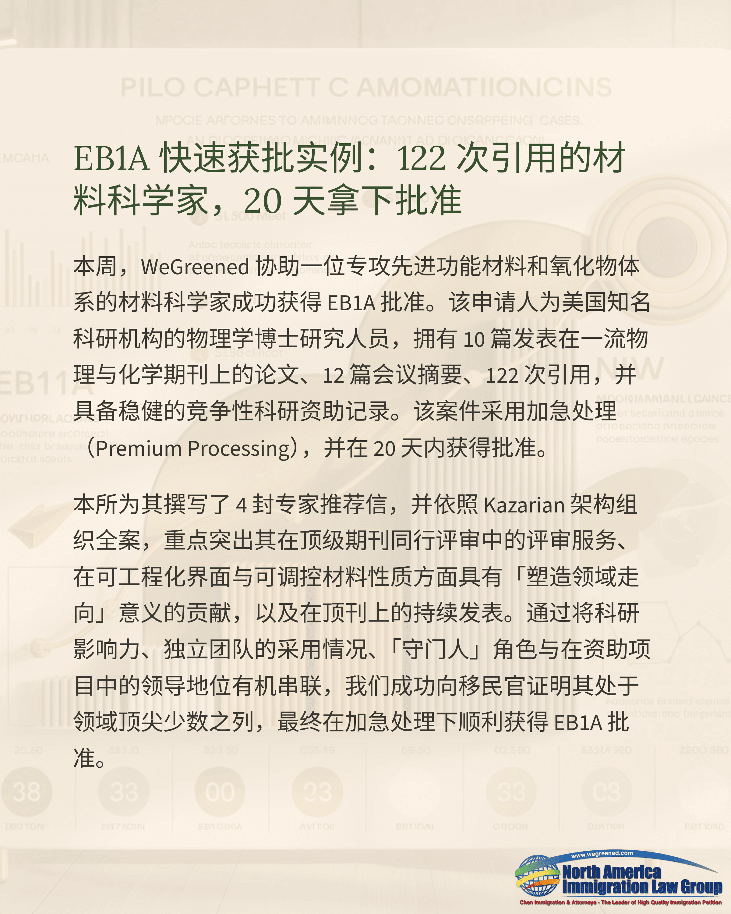 EB1A快速获批实例:122次引用的材料科学家,20天拿下批准
