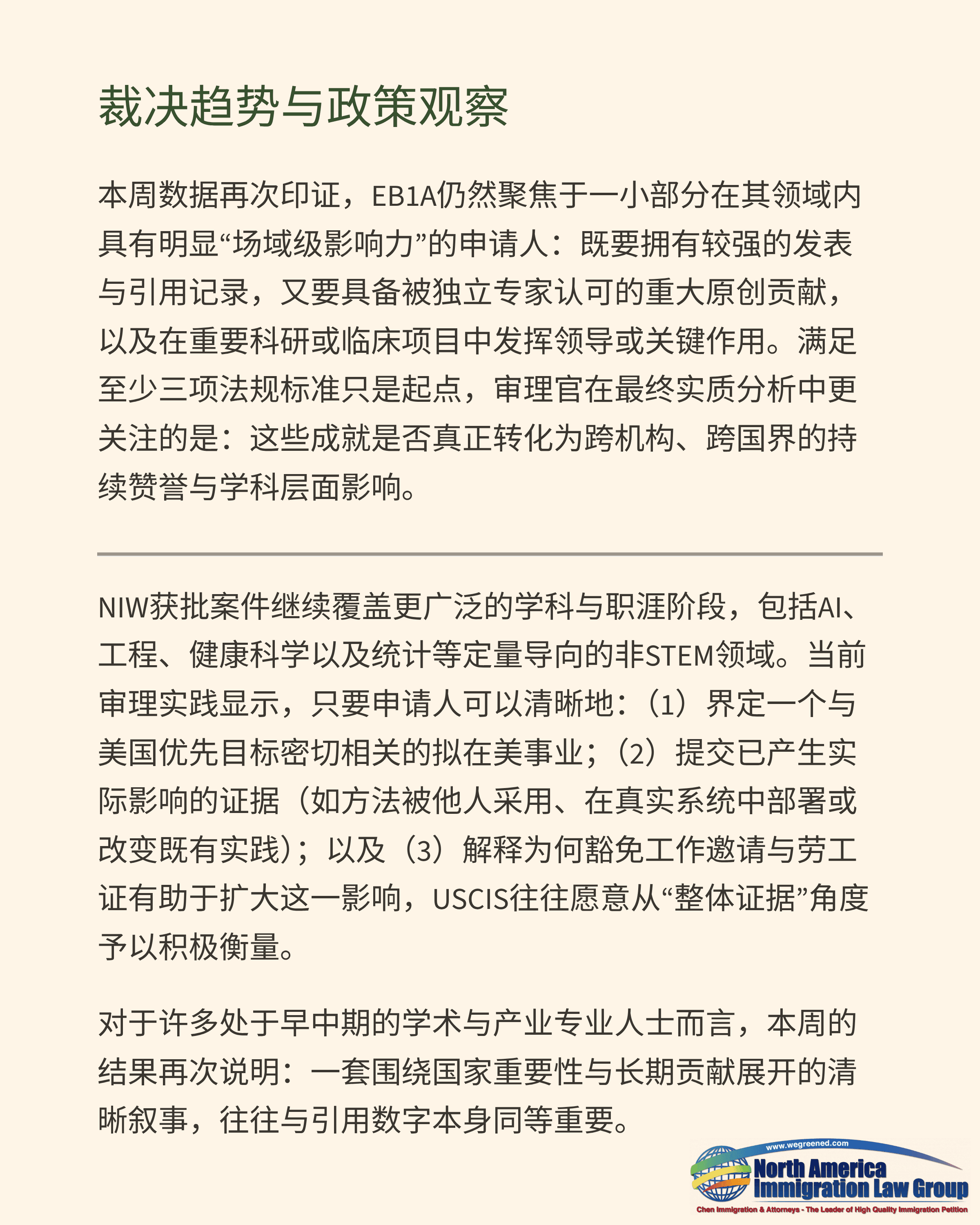 NIW获批案件继续覆盖更广泛的学科与职涯阶段,包括AI、工程、健康科学以及统计等定量导向的非STEM领域。当前审理实践显示,只要申请人可以清晰地:(1)界定一个与美国优先目标密切相关的拟在美事业;(2)提交已产生实际影响的证据(如方法被他人采用、在真实系统中部署或改变既有实践);以及(3)解释为何豁免工作邀请与劳工证有助于扩大这一影响,USCIS往往愿意从“整体证据”角度予以积极衡量。对于许多处于早中期的学术与产业专业人士而言,本周的结果再次说明:一套围绕国家重要性与长期贡献展开的清晰叙事,往往与引用数字本身同等重要。