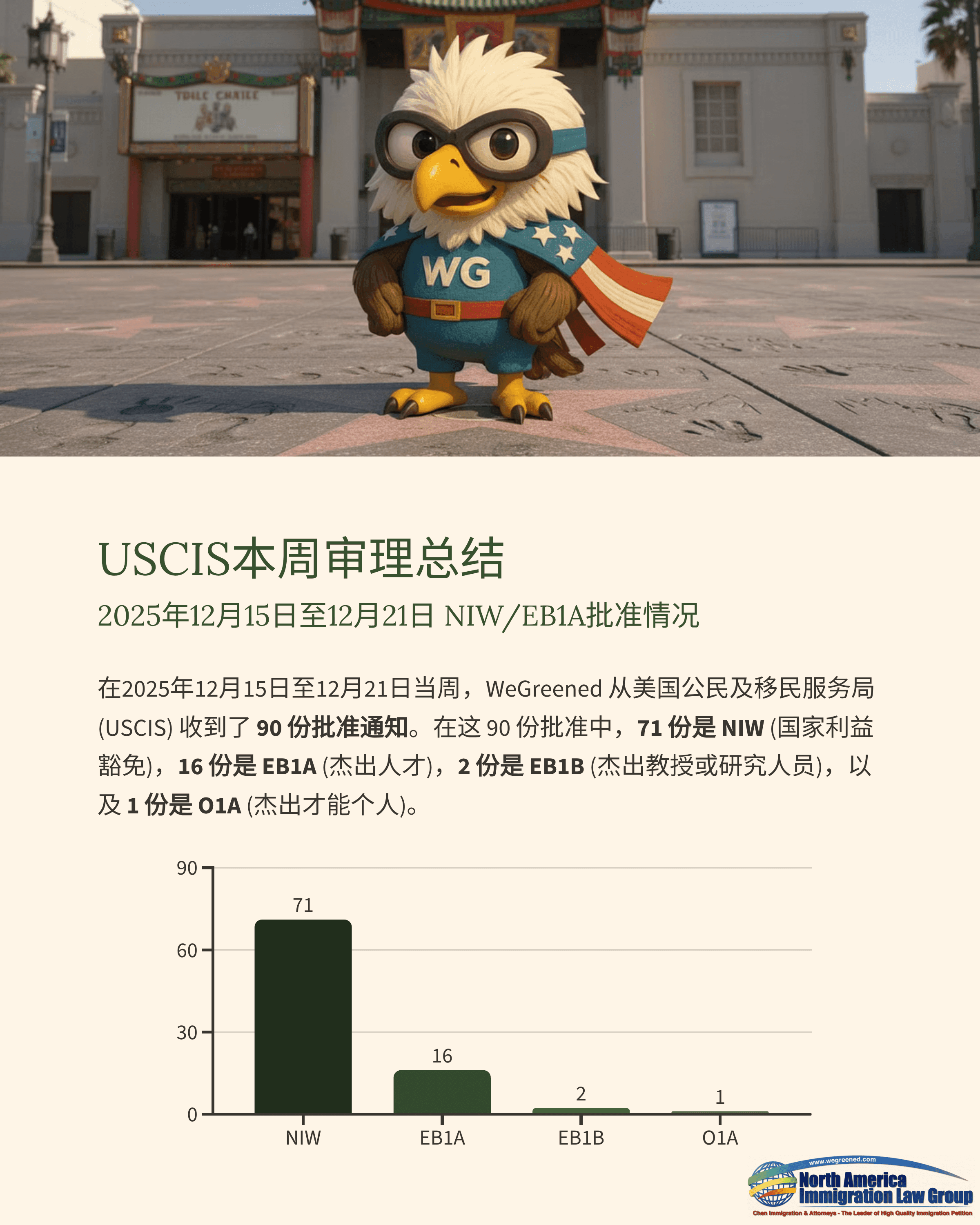 在2025年12月15日至2025年12月21日这一周内,WeGreened 共收到来自美国移民局(USCIS)的90份批准通知书。其中,NIW(国家利益豁免)71件、EB1A(杰出人才)16件、EB1B(杰出教授/研究人员)2件、O1A(杰出才能个人)1件。