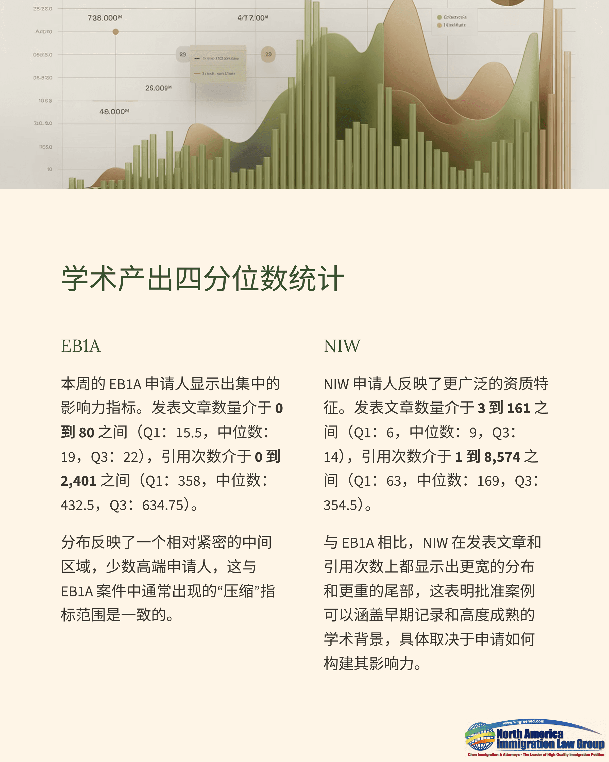 从分布来看,EB1A的中间段数据比较集中,特别高的极端值不算多,这也符合我们常见的情况:EB1A获批案例的学术指标往往更集中、波动更小。NIW在文章数与引用数上分布更宽、长尾更明显,说明获批案例既包含早期阶段的学术记录,也包含已经建立较强学术影响力的成熟研究者,关键还是看申请材料如何把“影响力”和“未来收益”讲清楚、讲扎实。