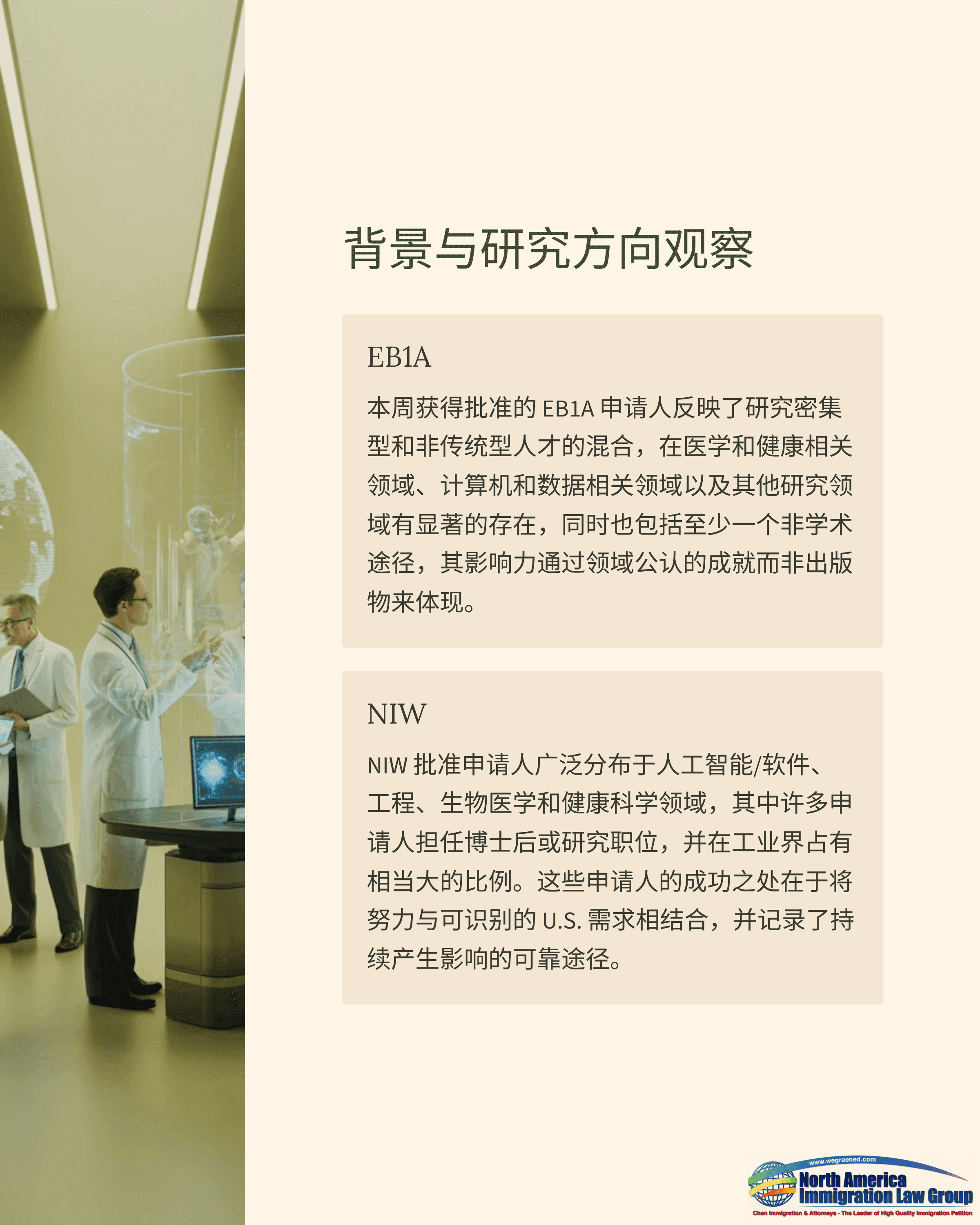 本周EB1A获批案例既包含研究强度较高的传统路线,也出现了一些更偏非传统的获批类型。领域分布上,在医学与健康相关方向、计算机与数据相关方向及其他研究型领域都有明显出现,同时也包含至少一例非学术路线的EB1A获批,其影响力主要通过业内认可的成果来体现,而不是靠论文发表来证明。