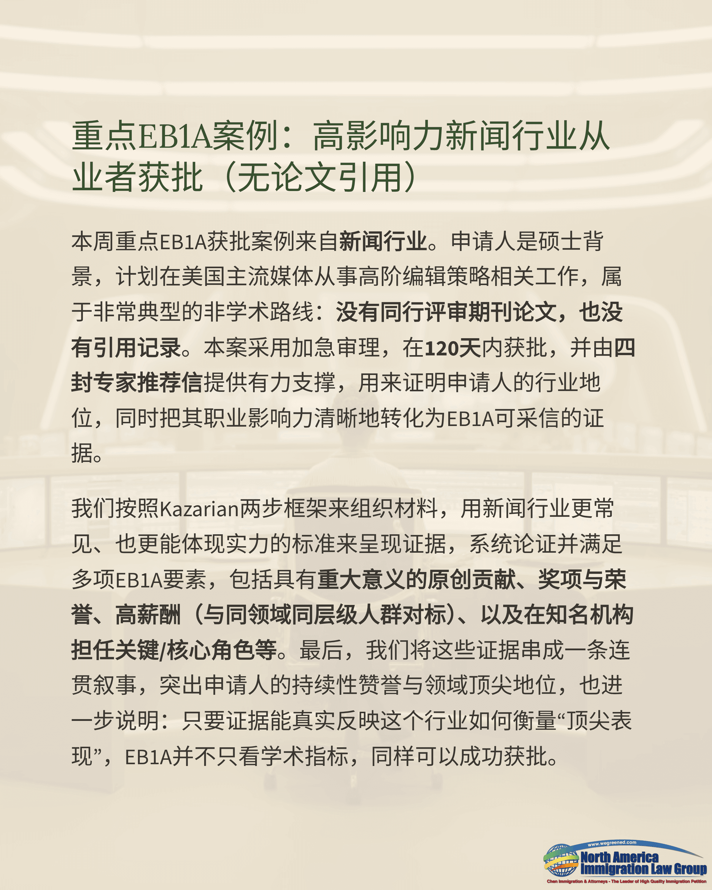本周一例值得关注的EB1A获批案例来自新闻行业。申请人是硕士背景,计划在美国主流媒体从事高阶编辑策略相关工作。与我们多数以学术背景为主的案例不同,本案属于典型的非学术路线:申请记录中没有同行评审期刊论文,也没有引用记录,但依然通过符合行业评估方式的证据体系,证明其“杰出能力”可以成立。该案采用加急审理,在120天内获批;本所为其准备了四封详细的专家推荐信,用于验证其行业地位,并将职业影响力清晰地转译到EB1A的审理逻辑之下。