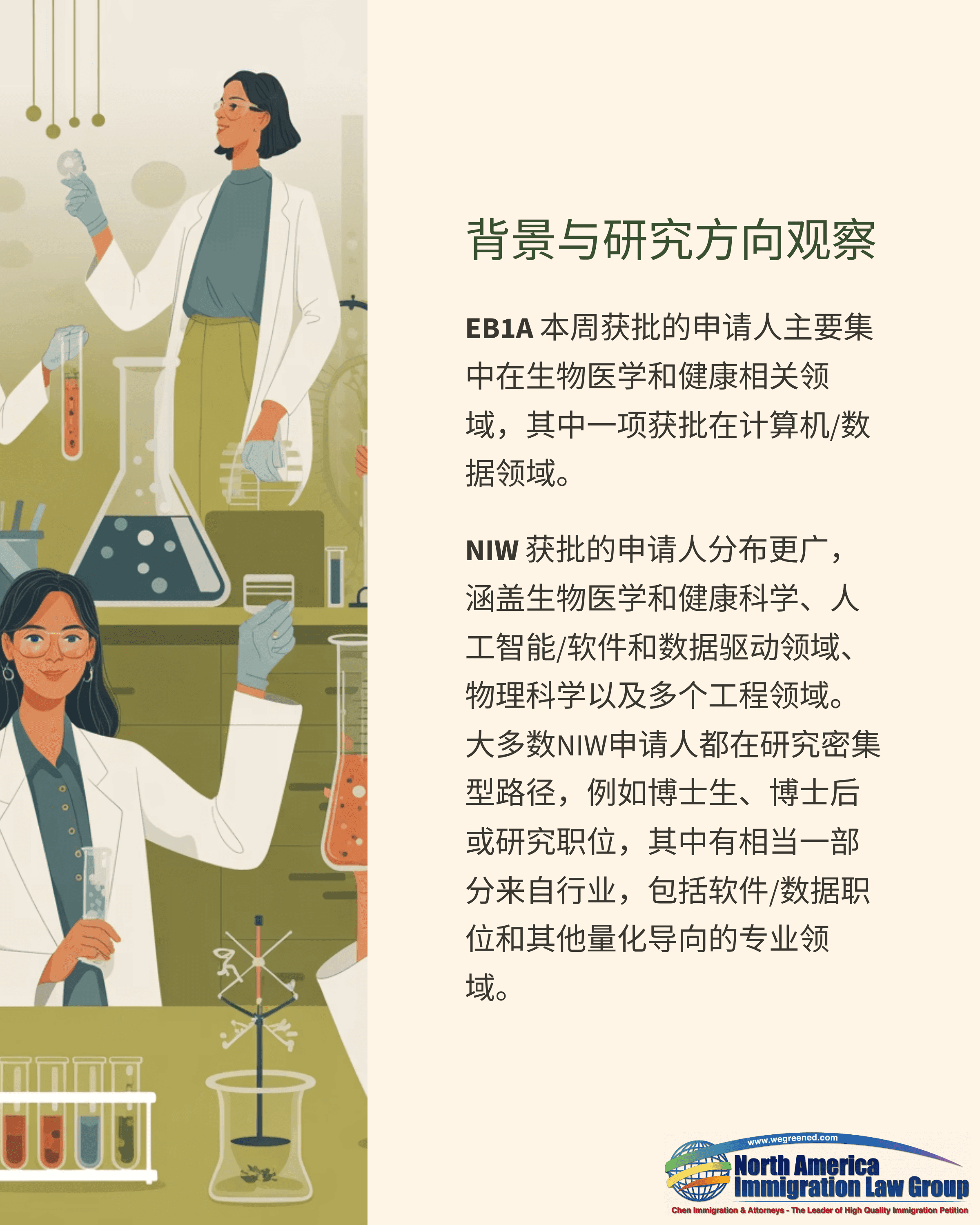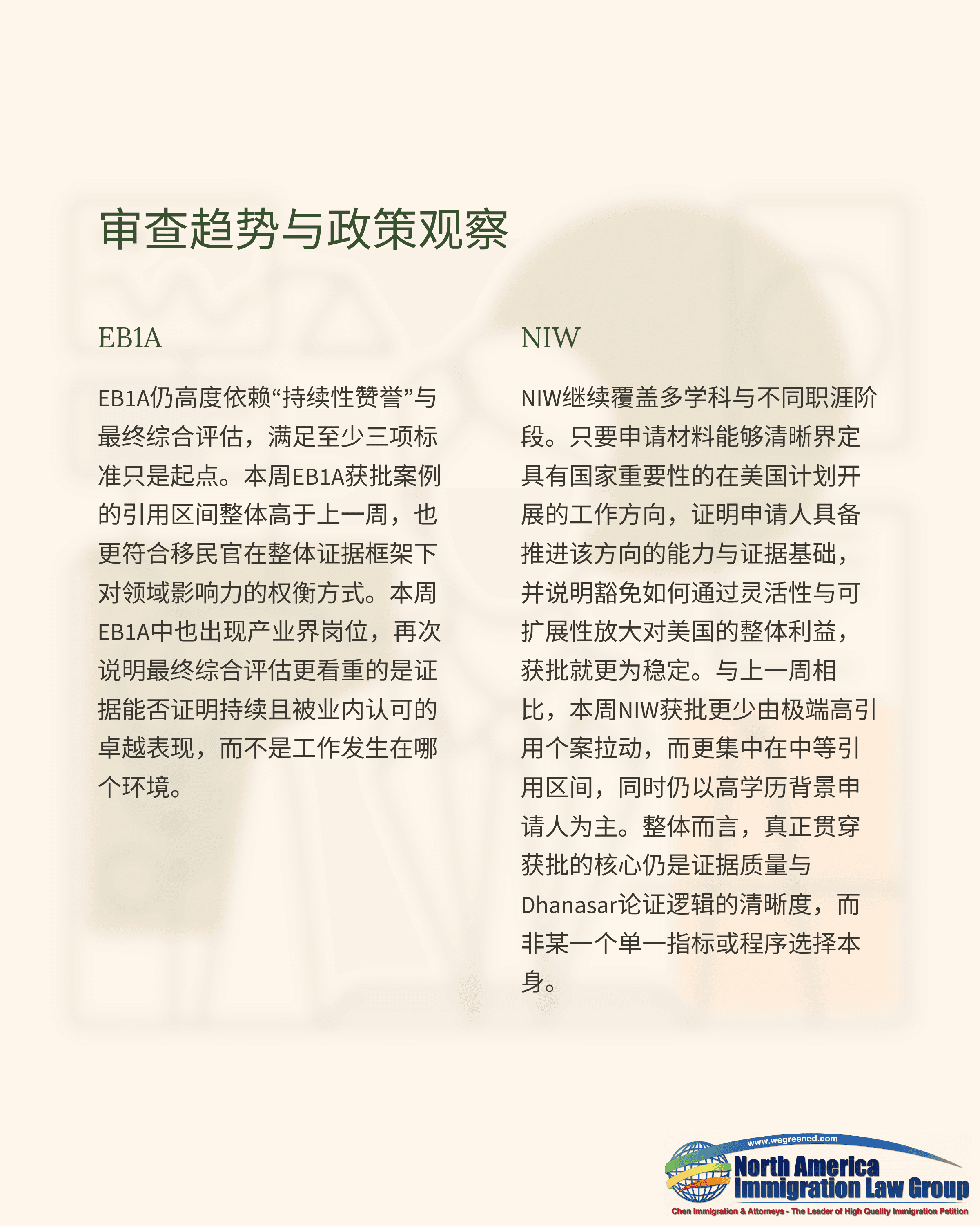 本周NIW仍占多数,EB1A则在能够以整体证据证明“持续性赞誉与领域影响力”的申请人中保持稳定表现。