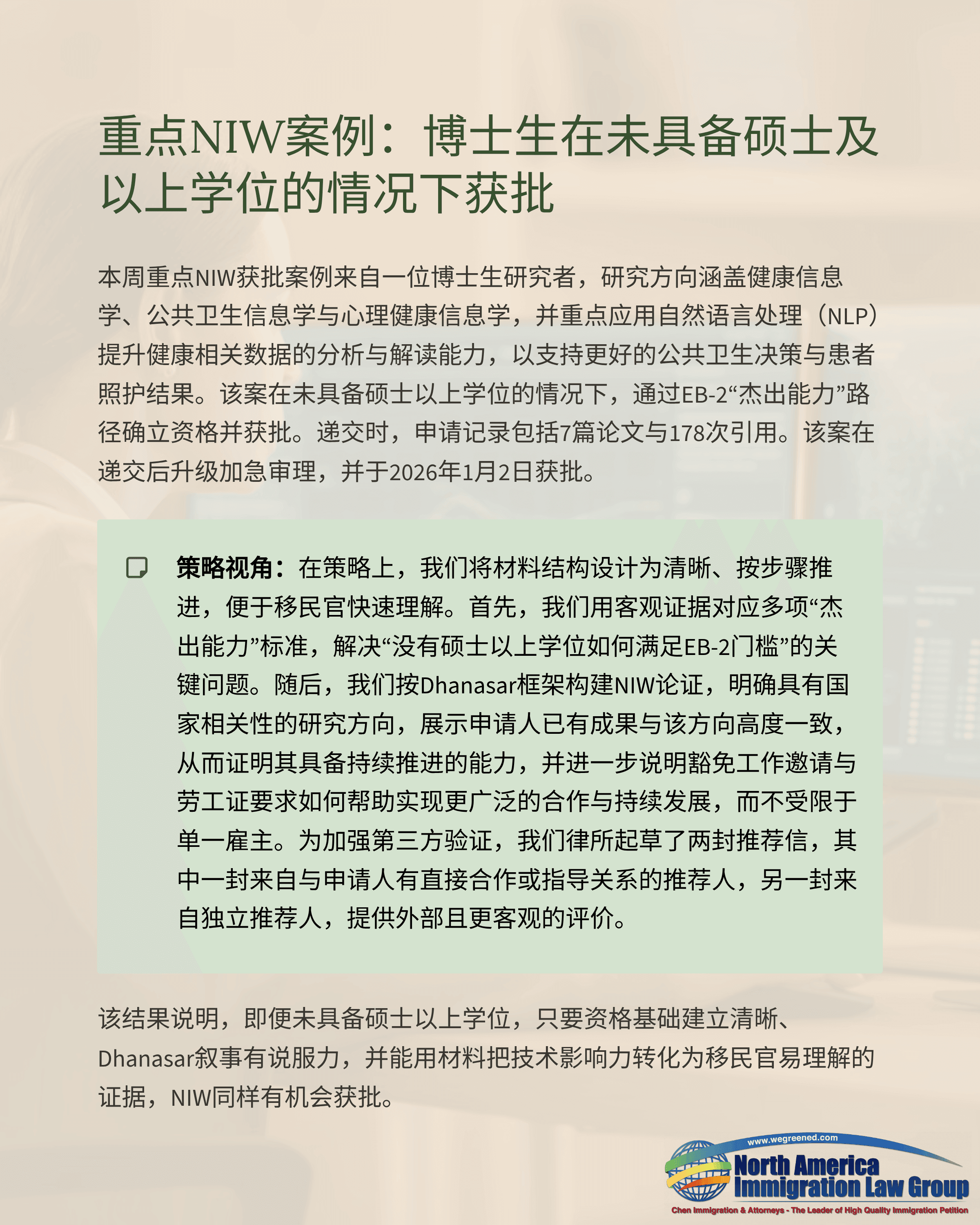 本周重点NIW获批案例来自一位博士生研究者,研究方向涵盖健康信息学、公共卫生信息学与心理健康信息学,并重点应用自然语言处理(NLP)提升健康相关信息的分析与解读能力,以支持更好的公共卫生决策与患者照护结果。该案在未具备硕士及以上学位的情况下,通过EB-2“杰出能力”路径建立资格并获批。递交时,申请记录包括7篇论文与178次引用,体现出扎实的早期研究势头。该案在递交后进行了加急升级,并于2026年1月2日获批。