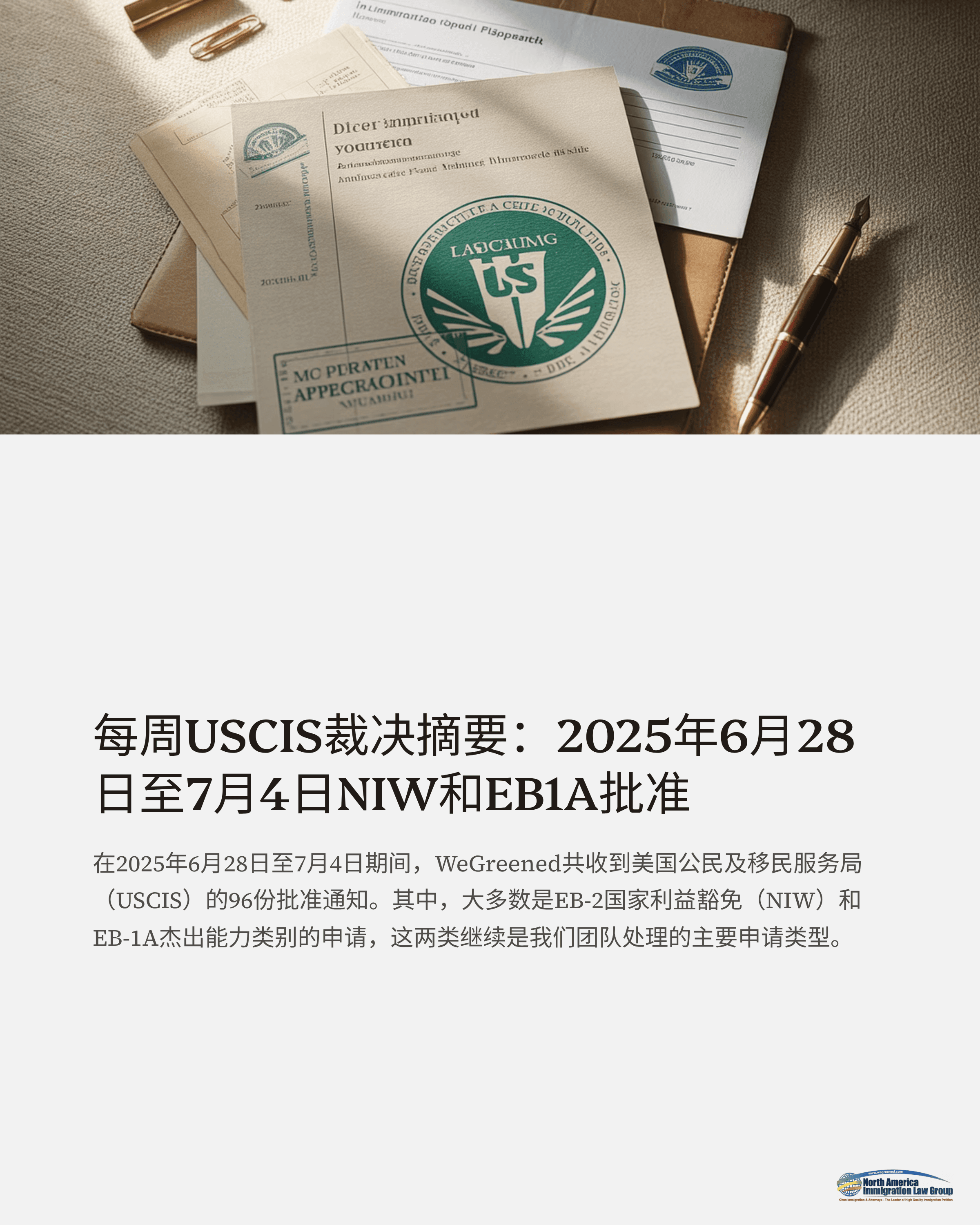 在2025年6月28日至7月4日这一周内,WeGreened共收到来自美国移民局(USCIS)的96份批准通知。其中大多数为EB-2国家利益豁免(NIW)与EB-1A杰出人才类别,这两类仍是我们团队主要办理的申请类型。
