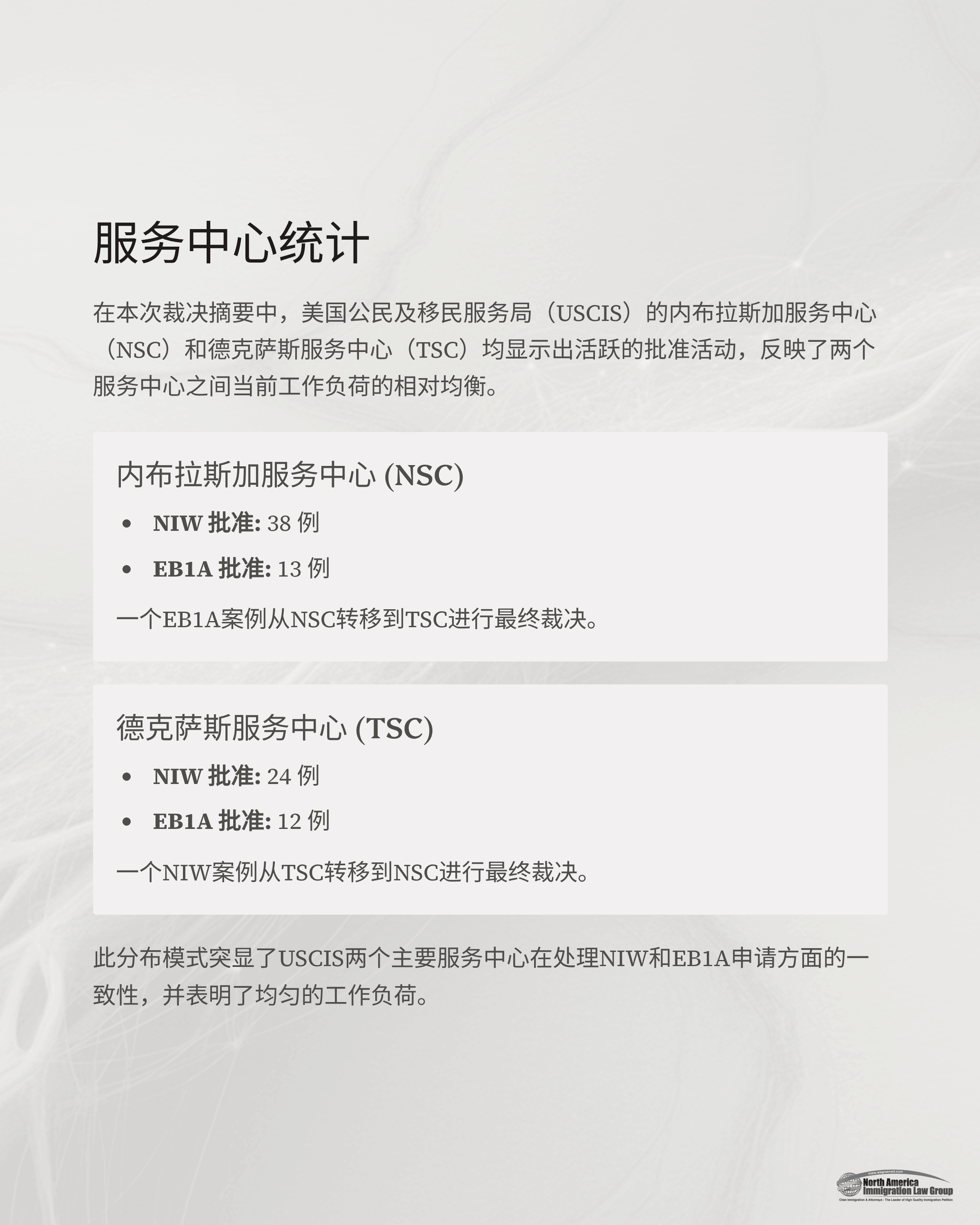 在26件EB1A批准中,13件由NSC发出,12件由TSC发出,另有1件案件从NSC转至TSC。此类相对平均的分布反映两大服务中心目前的工作量平衡,也体现出审理流程的一致性。