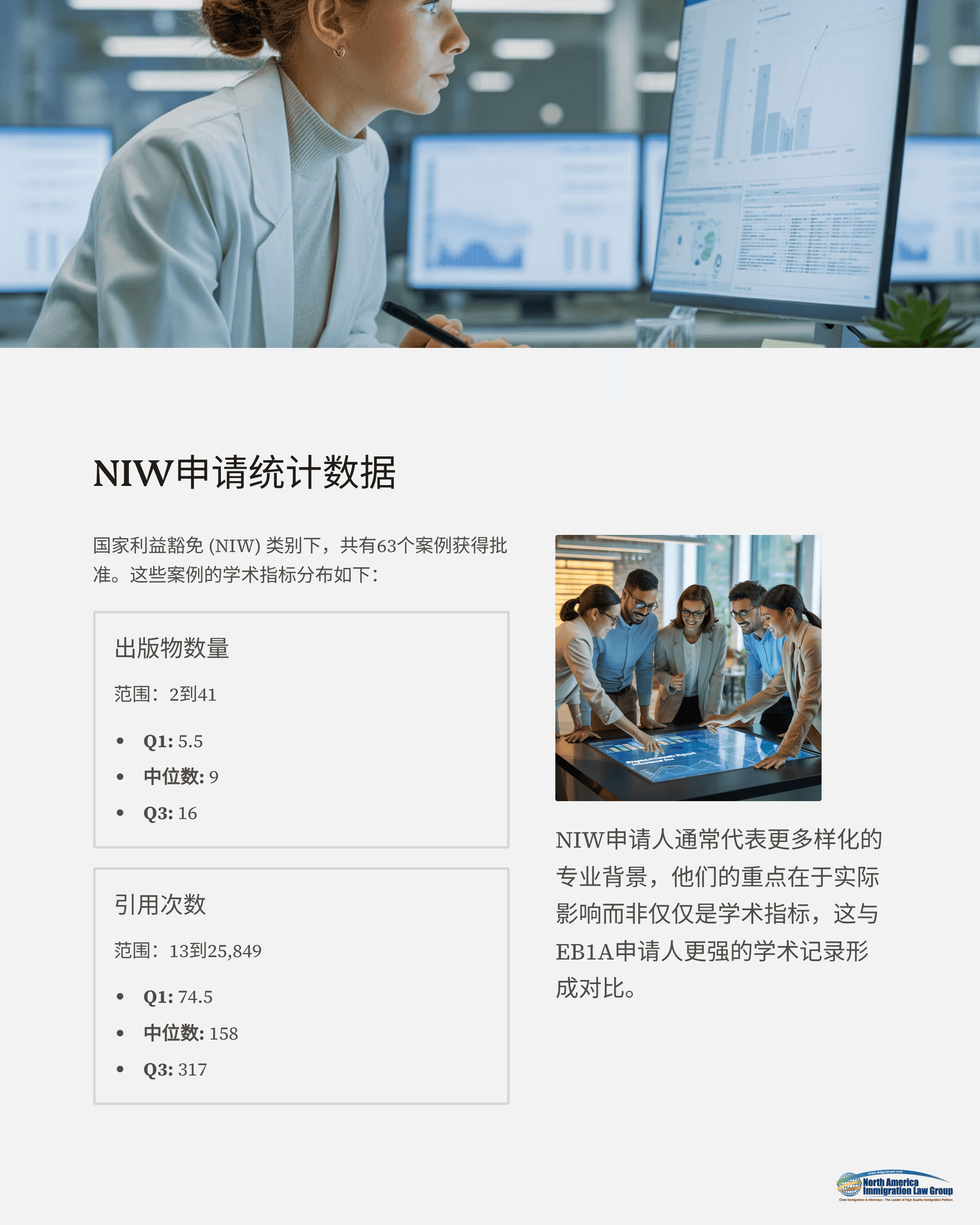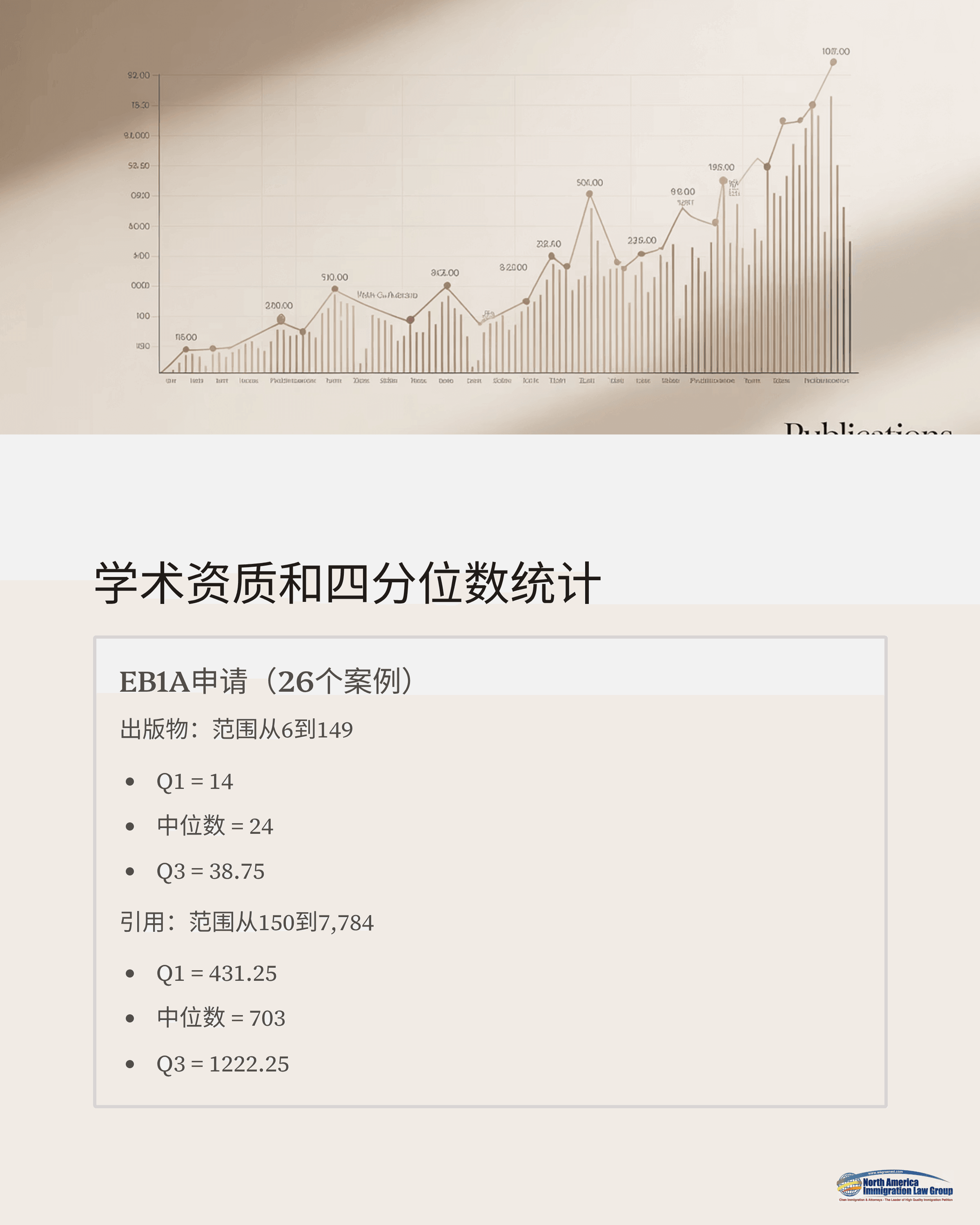 这些数据表明,EB1A申请人在发表数量和学术引用方面通常拥有更强的学术背景,符合USCIS对“杰出才能”的高标准。相比之下,NIW申请人则展现出更广泛的专业背景,强调实践影响力而非单一的学术指标。
