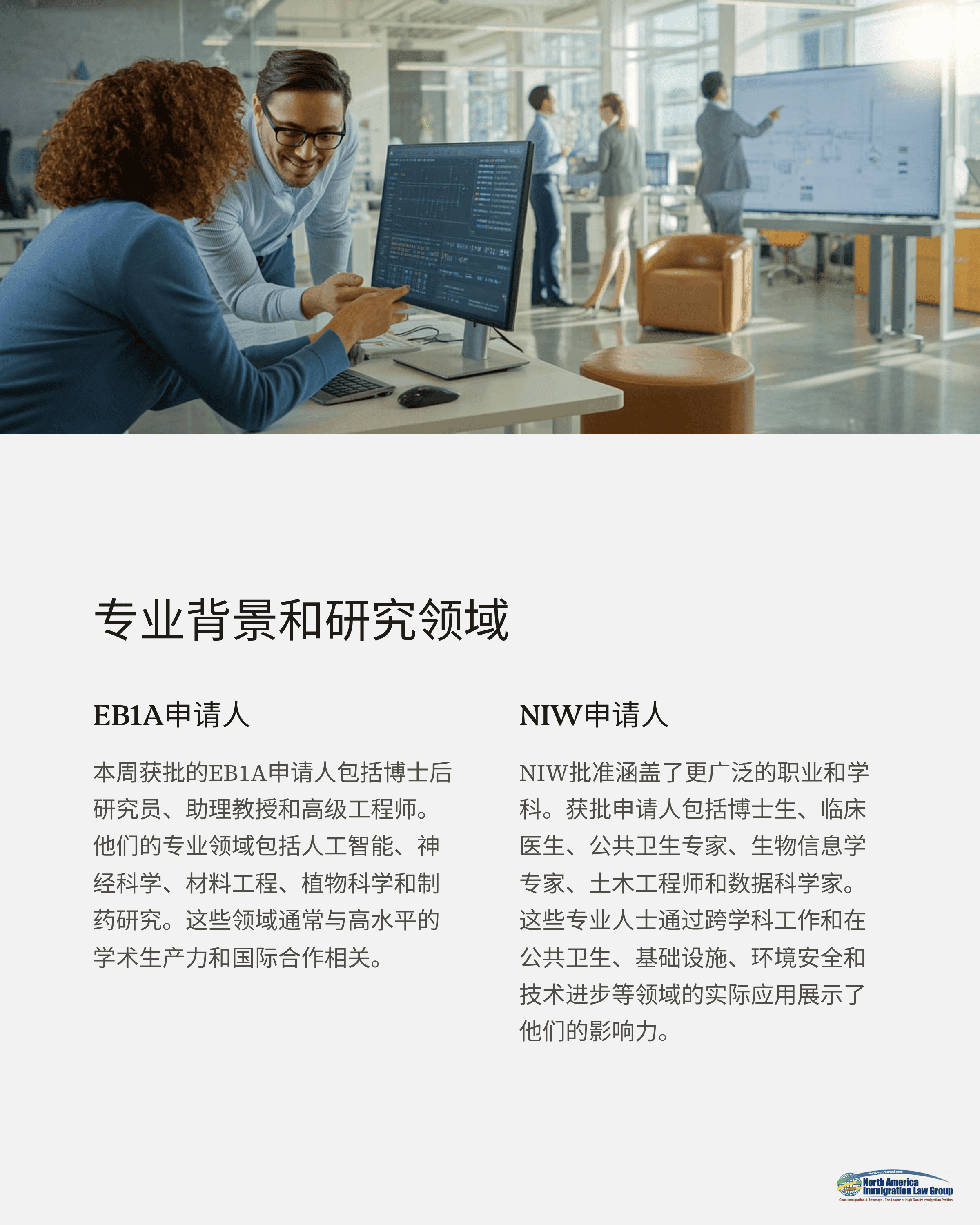 NIW申请人则来自更为多样的职业与学科背景。获批者包括博士生、临床医生、公共卫生专家、生物信息学工程师、土木工程师与数据科学家等。这些专业人士通过跨学科研究与现实应用,在公共卫生、基础建设、环境安全与科技发展等领域展现出显著影响力。