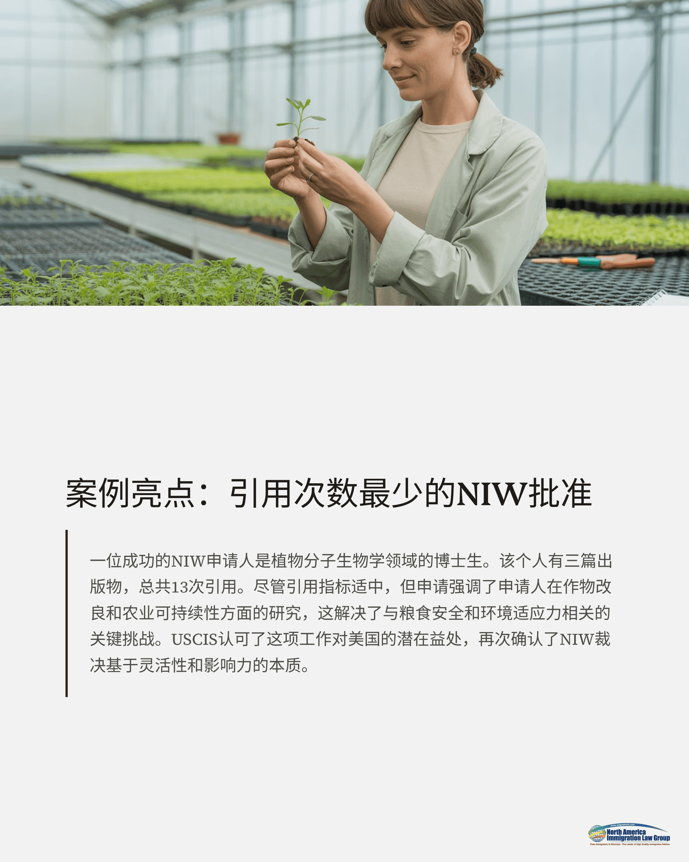 一位在植物分子生物学领域就读博士的NIW申请人尽管只有3篇论文、13次引用,依然获得批准。其申请强调其在作物改良与农业永续性方面的研究,切中粮食安全与环境韧性等国家关键议题。USCIS认可该研究对美国潜在的正面影响,显示NIW审理标准对实质贡献具有灵活性。