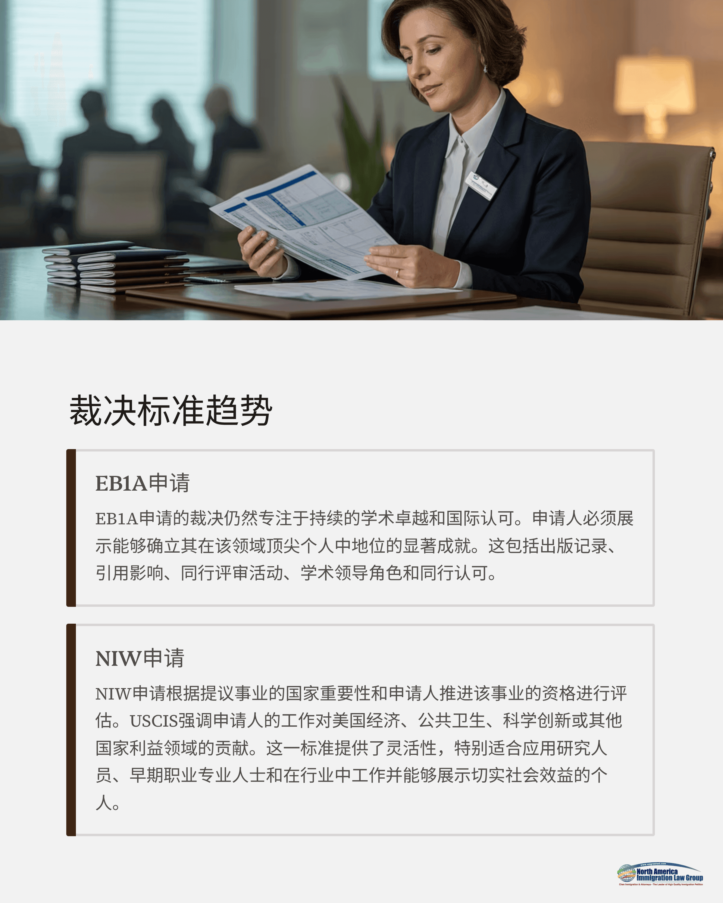 NIW类别则以申请人计划从事工作的重要性及其推进该工作之资格为核心。USCIS强调该工作对美国经济、公共健康、科研创新或其他国家利益的贡献。该标准提供更大的弹性,尤其适合应用型研究人员、职业早期人才或在产业界具有实质成果的专业人士。