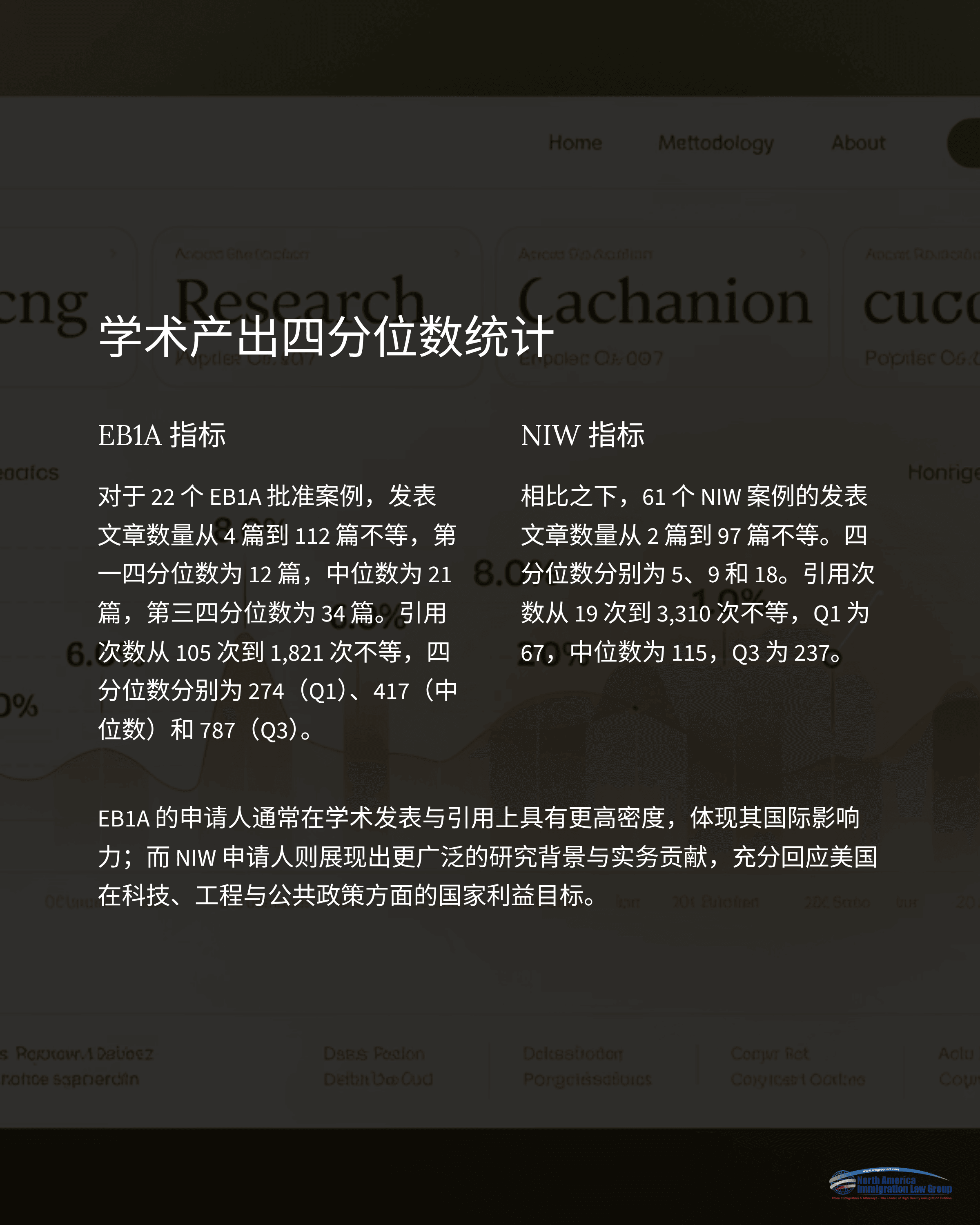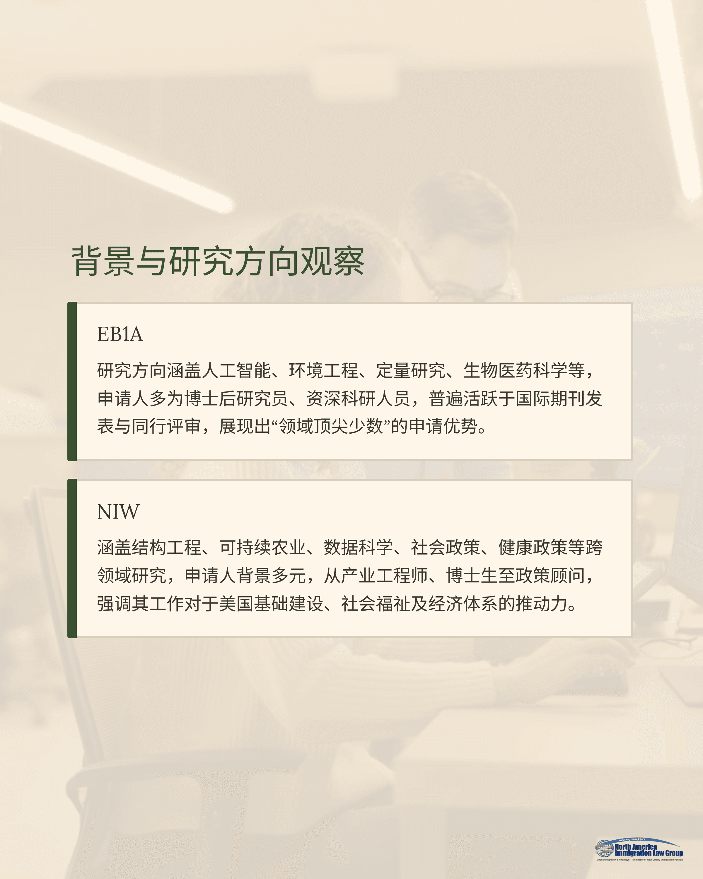 EB1A 的申请人通常在学术发表与引用上具有更高密度,体现其国际影响力;而 NIW 申请人则展现出更广泛的研究背景与实务贡献,充分回应美国在科技、工程与公共政策方面的国家利益目标。