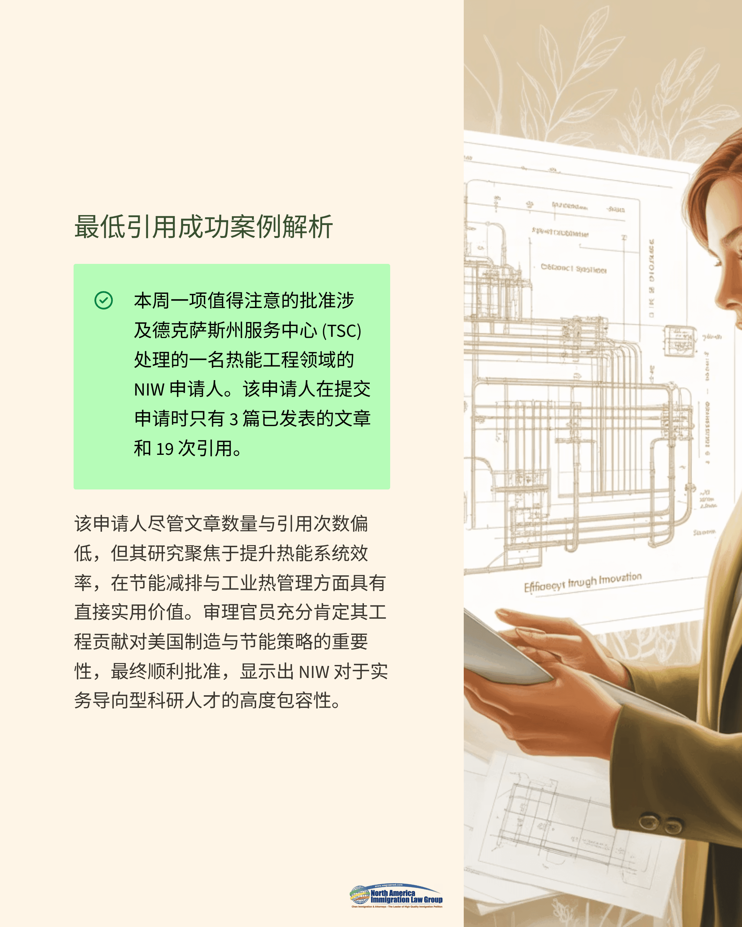 该申请人尽管文章数量与引用次数偏低,但其研究聚焦于提升热能系统效率,在节能减排与工业热管理方面具有直接实用价值。审理官员充分肯定其工程贡献对美国制造与节能策略的重要性,最终顺利批准,显示出 NIW 对于实务导向型科研人才的高度包容性。