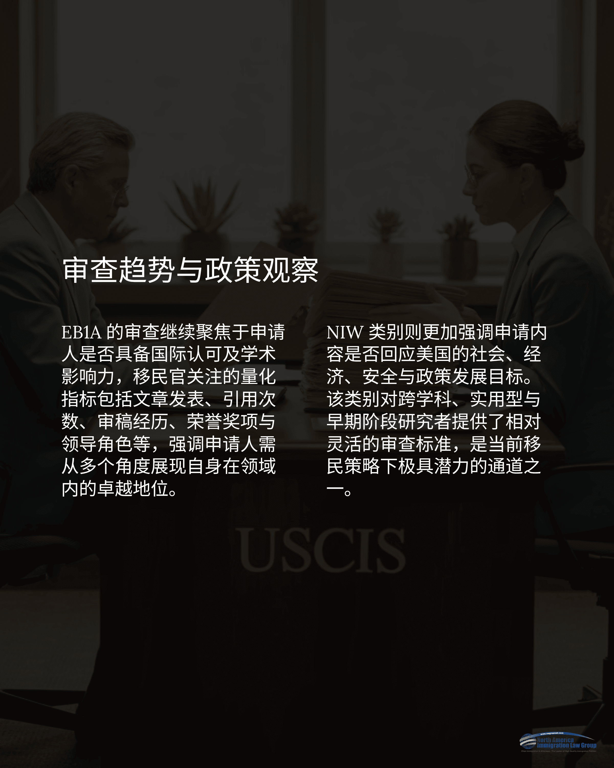 NIW 类别则更加强调申请内容是否回应美国的社会、经济、安全与政策发展目标。该类别对跨学科、实用型与早期阶段研究者提供了相对灵活的审查标准,是当前移民策略下极具潜力的通道之一。