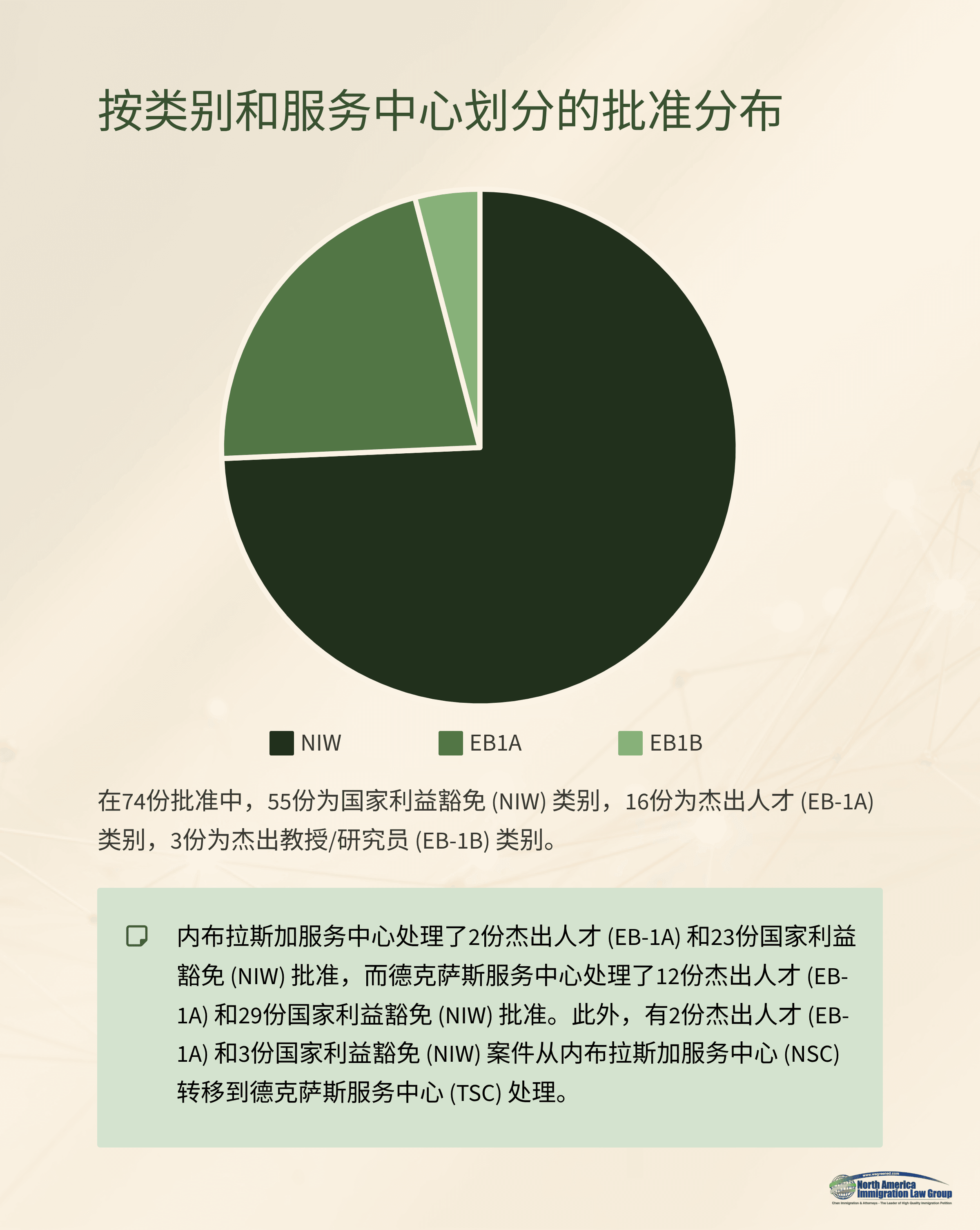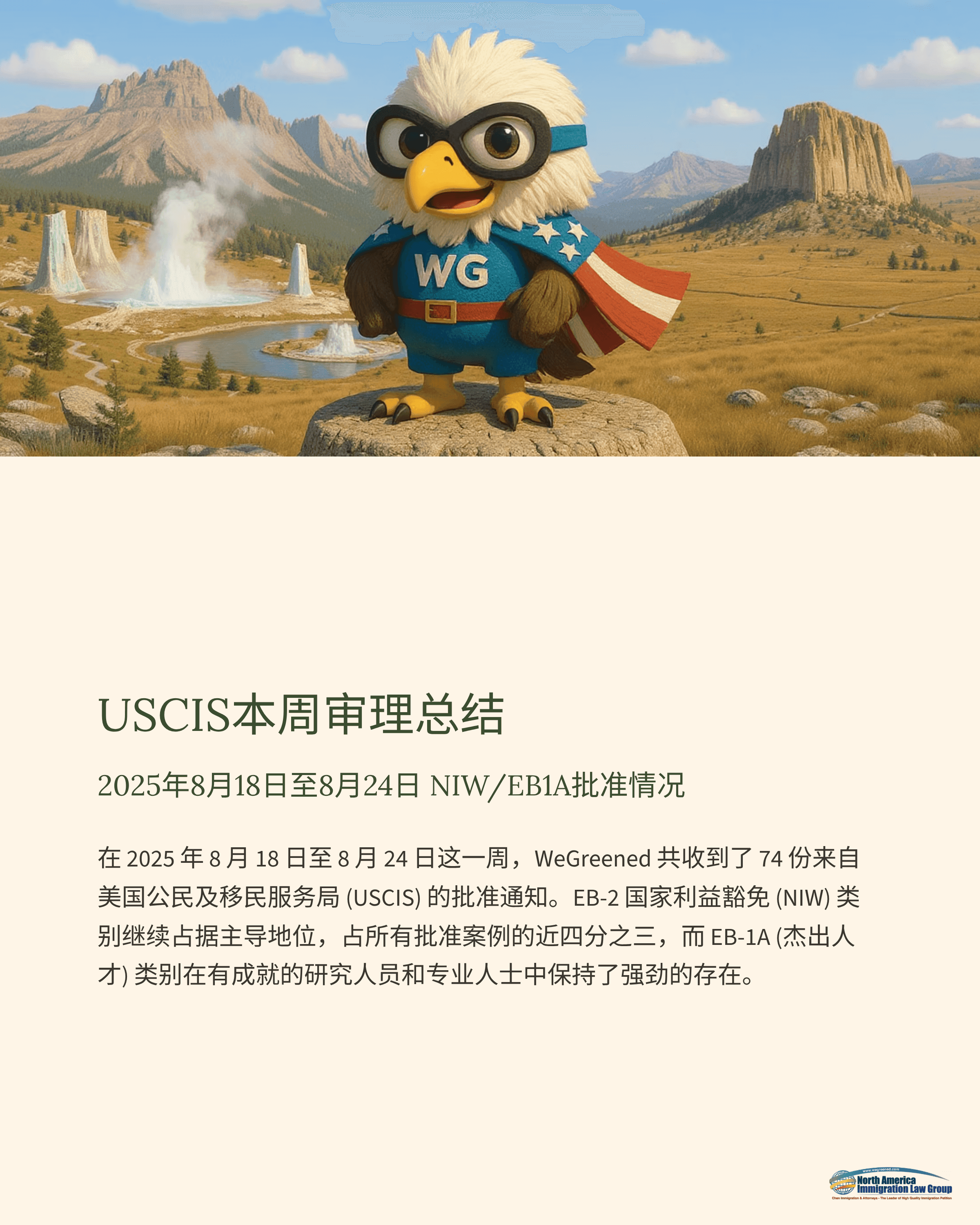 在2025年8月18日至8月24日这一周内,WeGreened 共收到来自美国移民局(USCIS)的 74份批准通知书。其中,EB-2 NIW(国家利益豁免)继续保持主导地位,占比超过七成;EB-1A(杰出人才)类别在科研人员和专业人士中也维持了稳定表现。