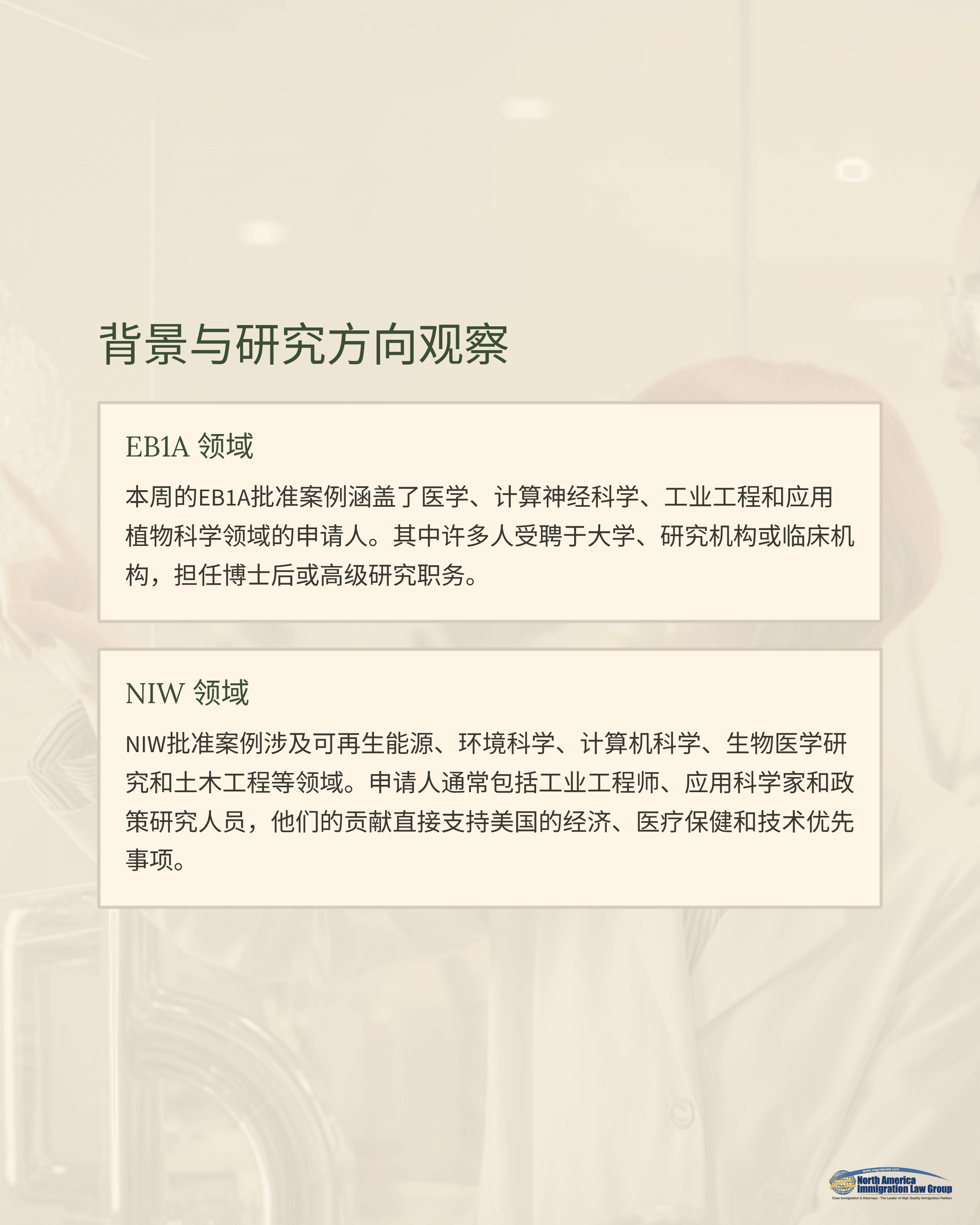 观察: EB1A申请人普遍具有较高的学术产出与国际影响力;而NIW则呈现出更多元的背景分布,包含产业研究人员与政策研究者,更强调研究与实践对美国国家利益的直接贡献。