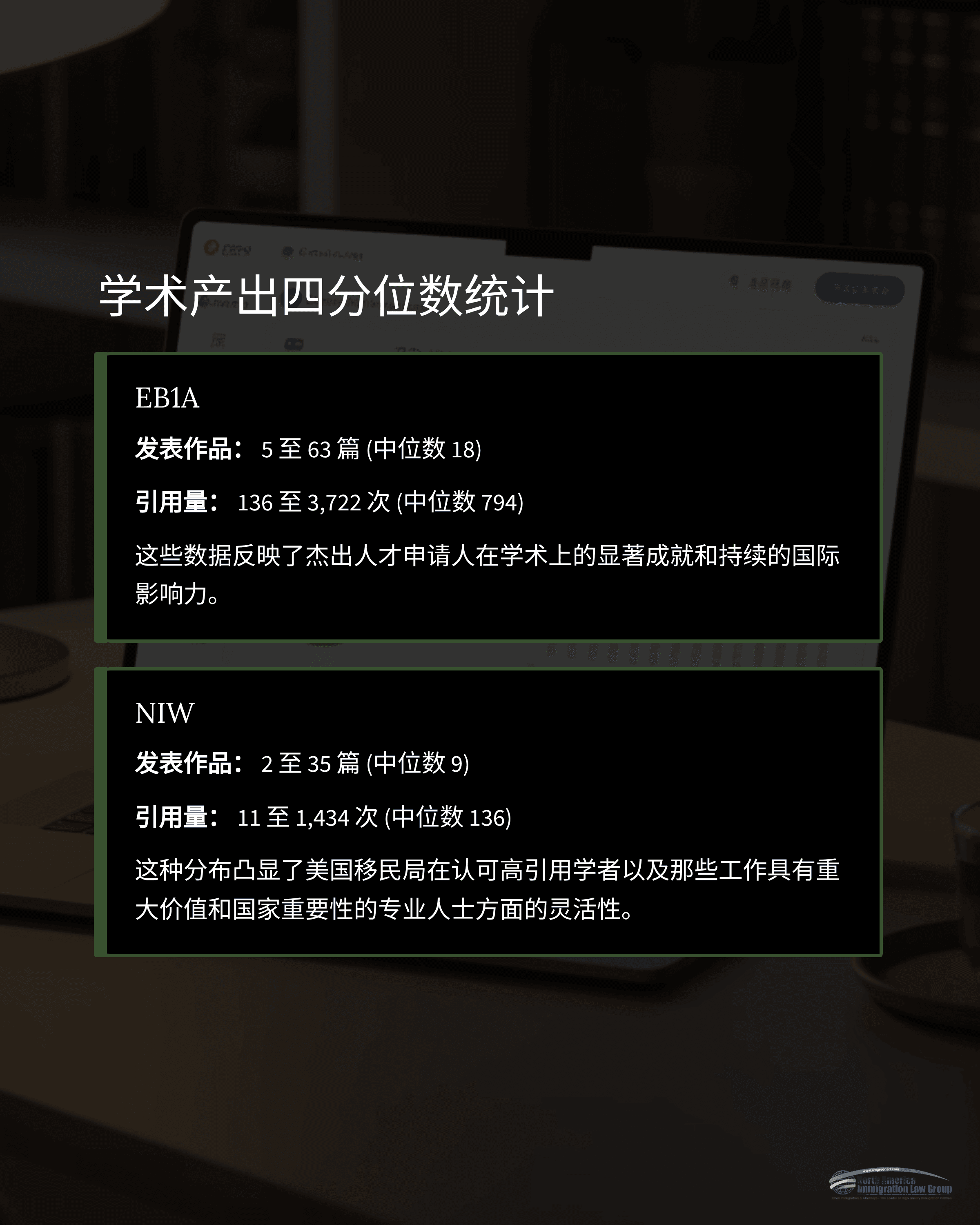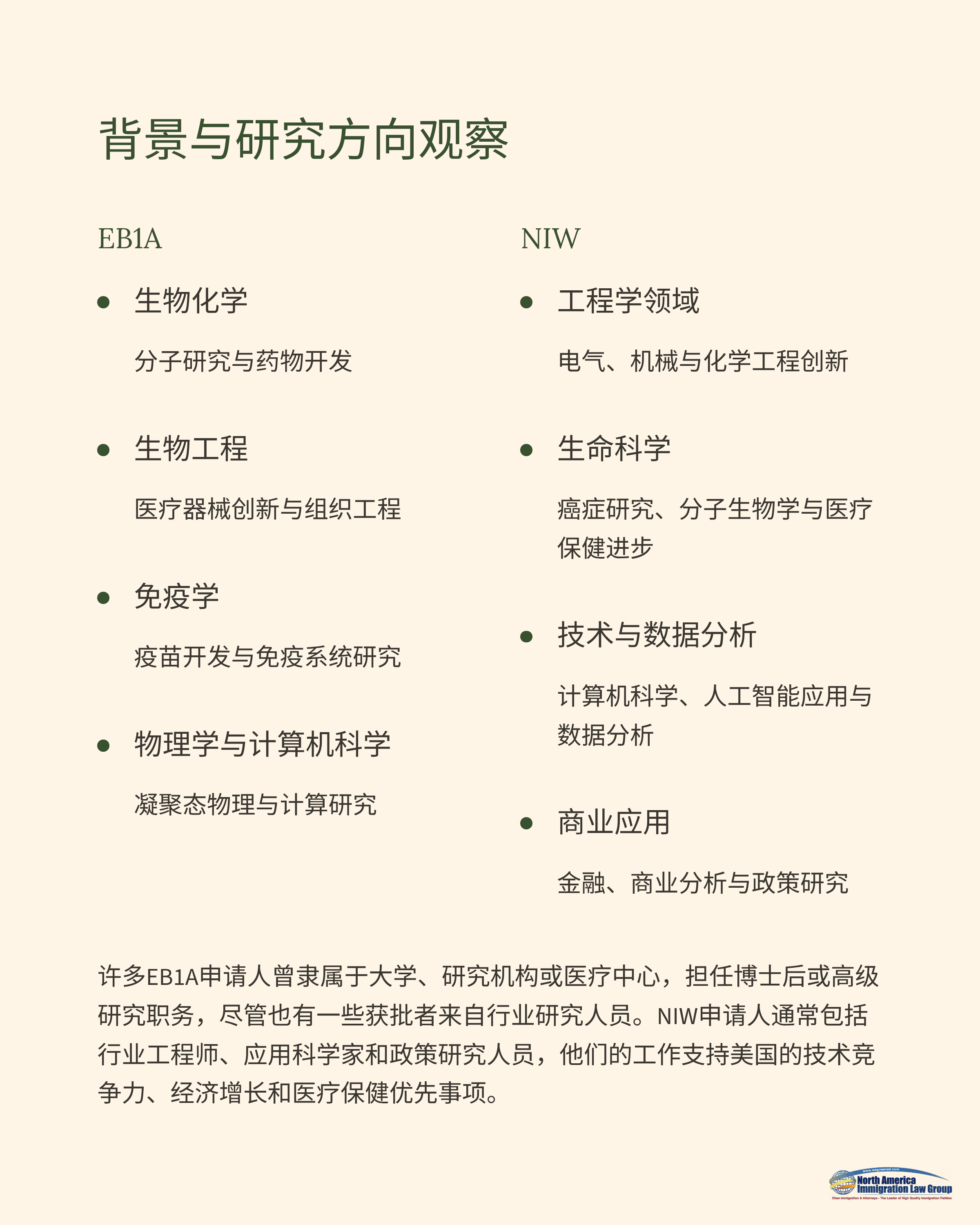 EB1A申请人普遍具有较高的学术产出与国际影响力;NIW则呈现更多元的背景与领域,尤其强调研究或实践对国家利益的直接贡献。