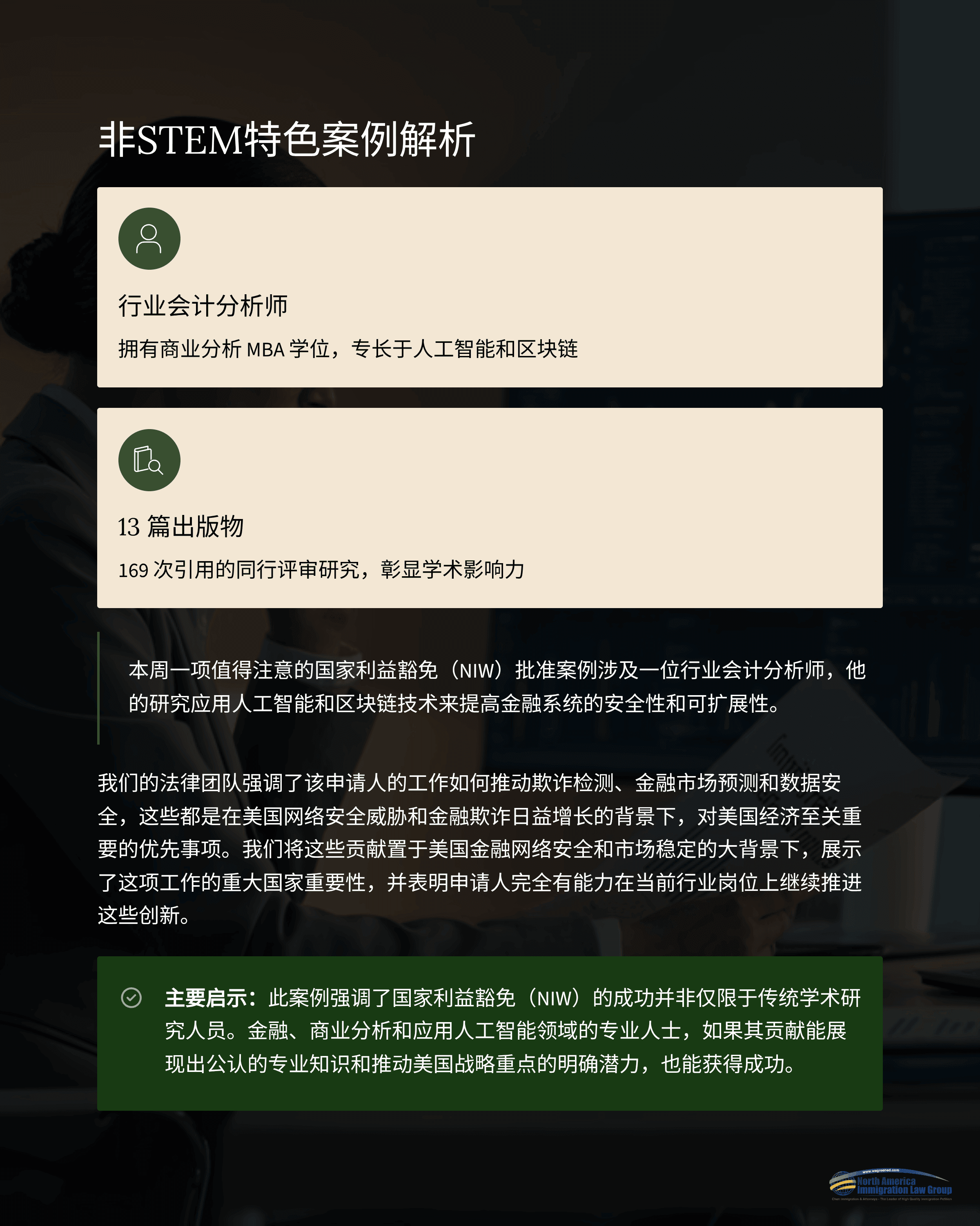 本周一则引人注目的NIW批准案例涉及一位产业界会计分析师,其研究专注于利用人工智能与区块链技术提升金融系统的数据安全性与可扩展性。申请人拥有商业分析MBA学位,共发表13篇同行评审论文并获得169次引用,在该交叉领域展现了突出的学术影响力和技术能力。
