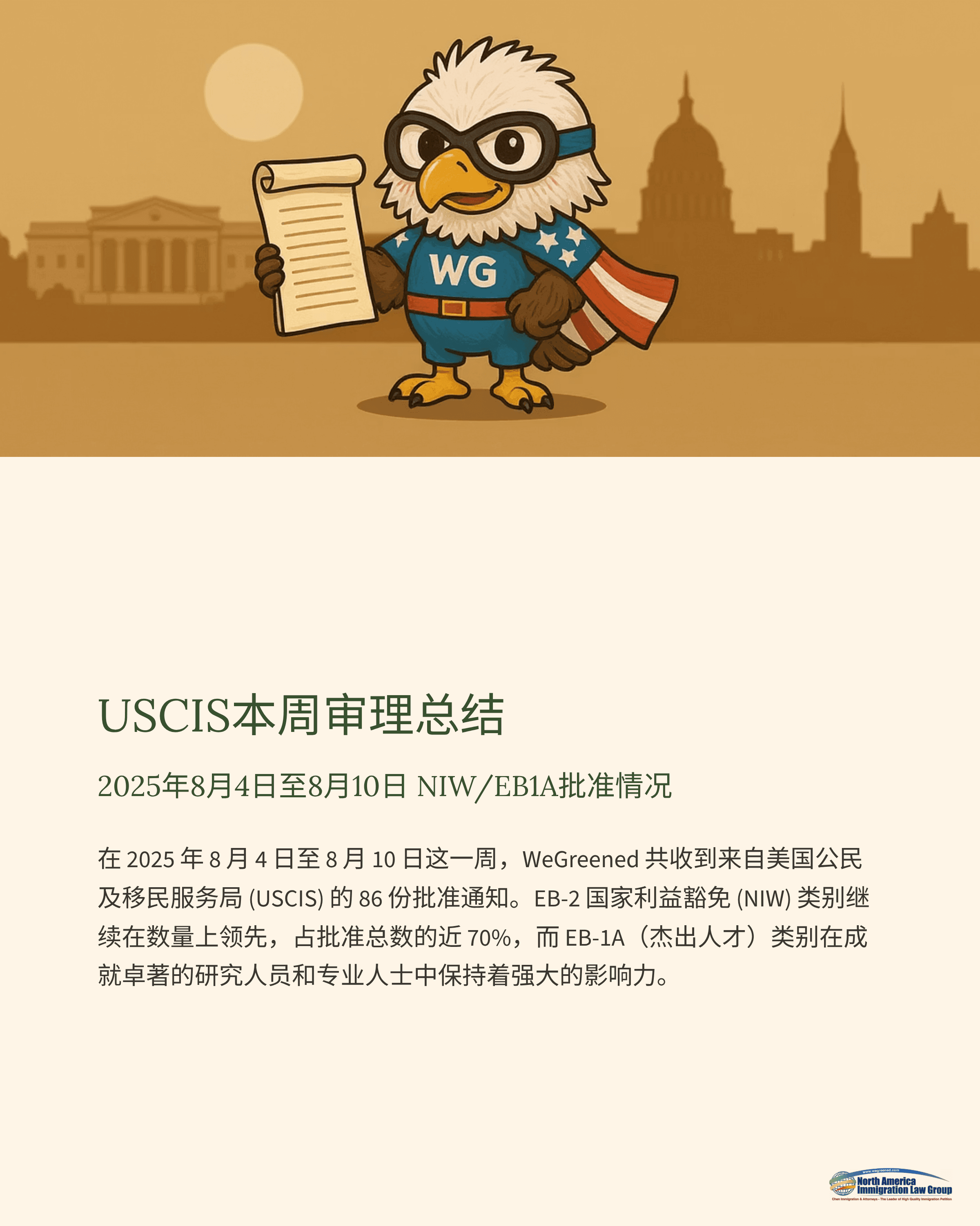 USCIS本周审理总结:2025年8月4日至8月10日 NIW/EB1A批准情况