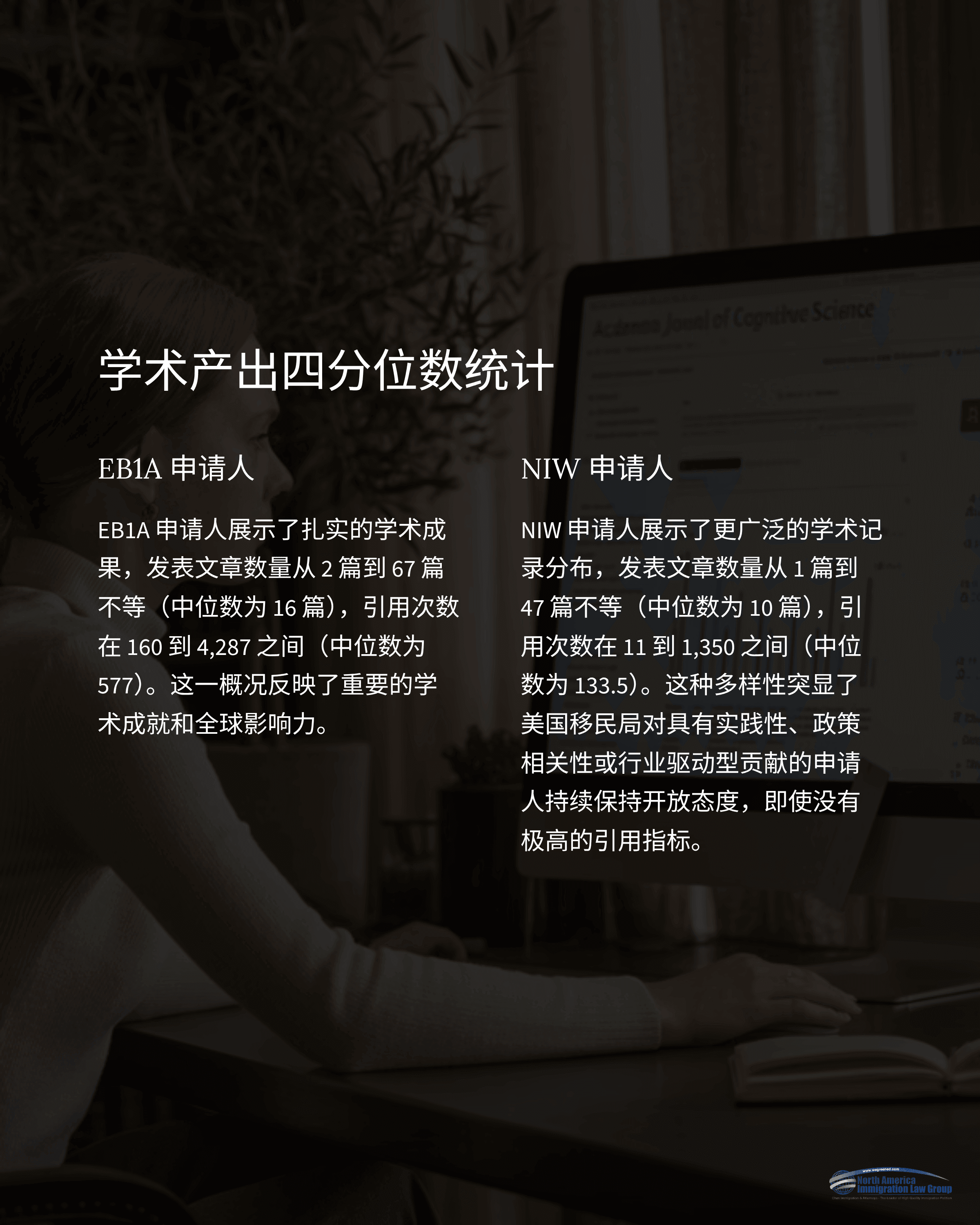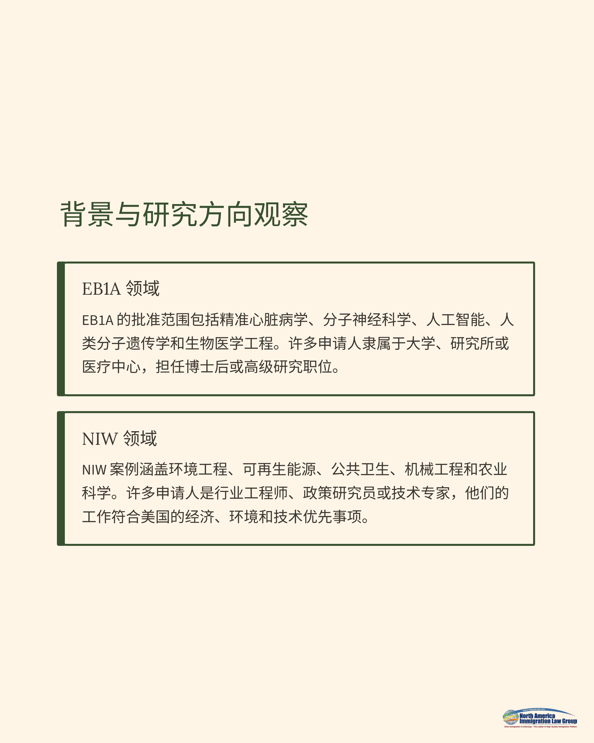 EB1A申请人普遍拥有较高的学术产出与国际影响力;而NIW则体现出更多元的背景与领域,更注重研究与实践对国家利益的直接贡献。