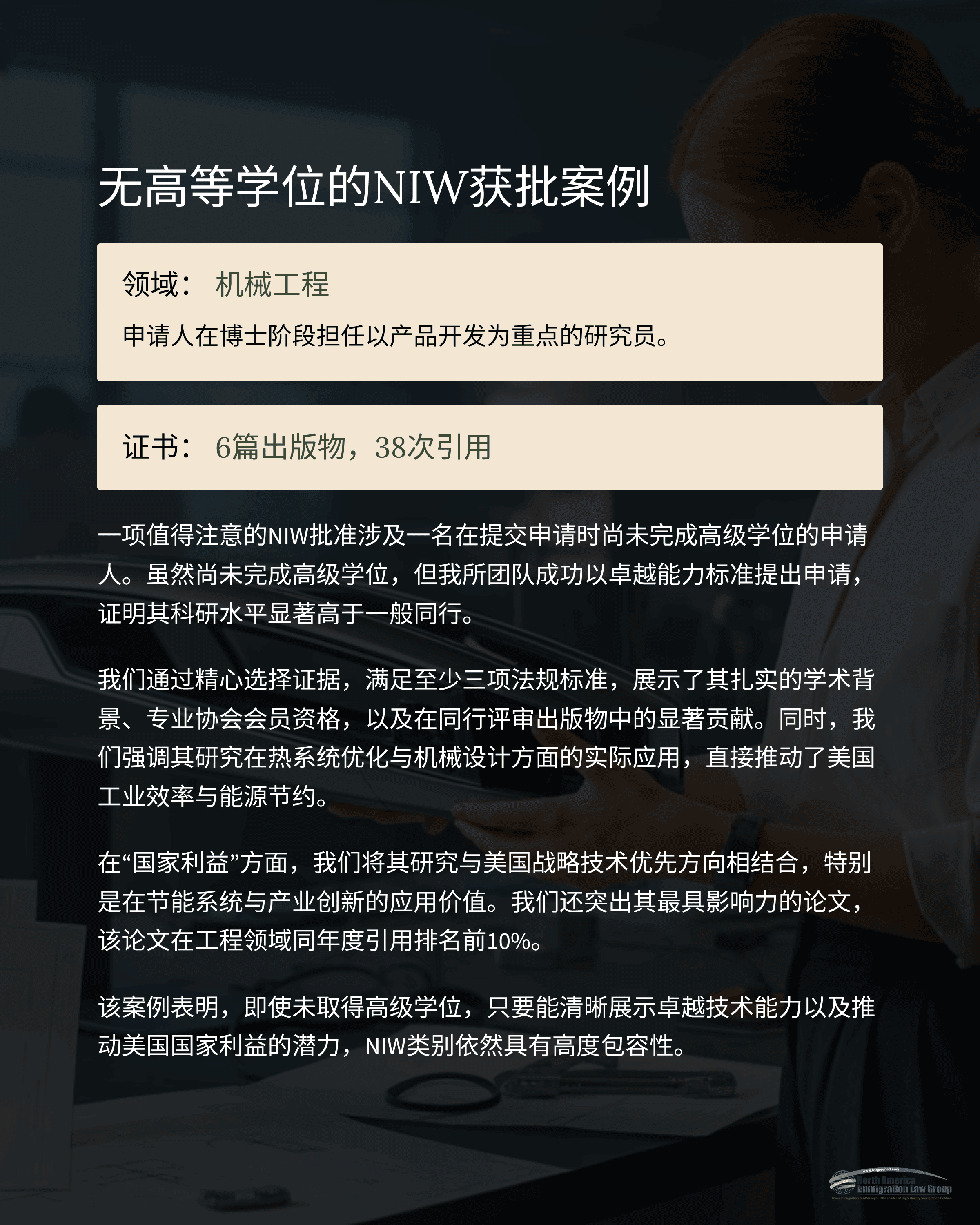 本周一则NIW批准案例涉及一位拥有机械工程学士学位、目前正在攻读博士学位的申请人,其学术记录包括6篇发表文章和38次引用。虽然尚未完成高级学位,但我所团队成功以卓越能力(Exceptional Ability)标准提出申请,证明其科研水平显著高于一般同行。
