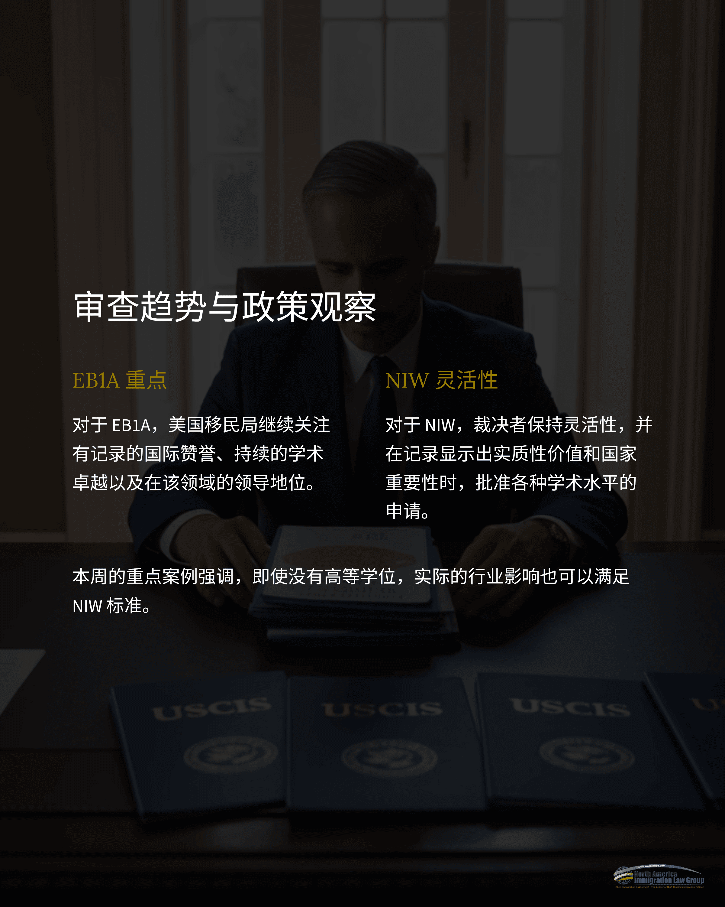 EB1A继续强调国际声誉、持续学术卓越与领域领导力。NIW保持灵活,只要能证明工作的实质价值与国家重要性,不同学术层级的申请人均有机会获批。本周的案例再次印证,具有实际产业影响的贡献同样符合NIW标准。