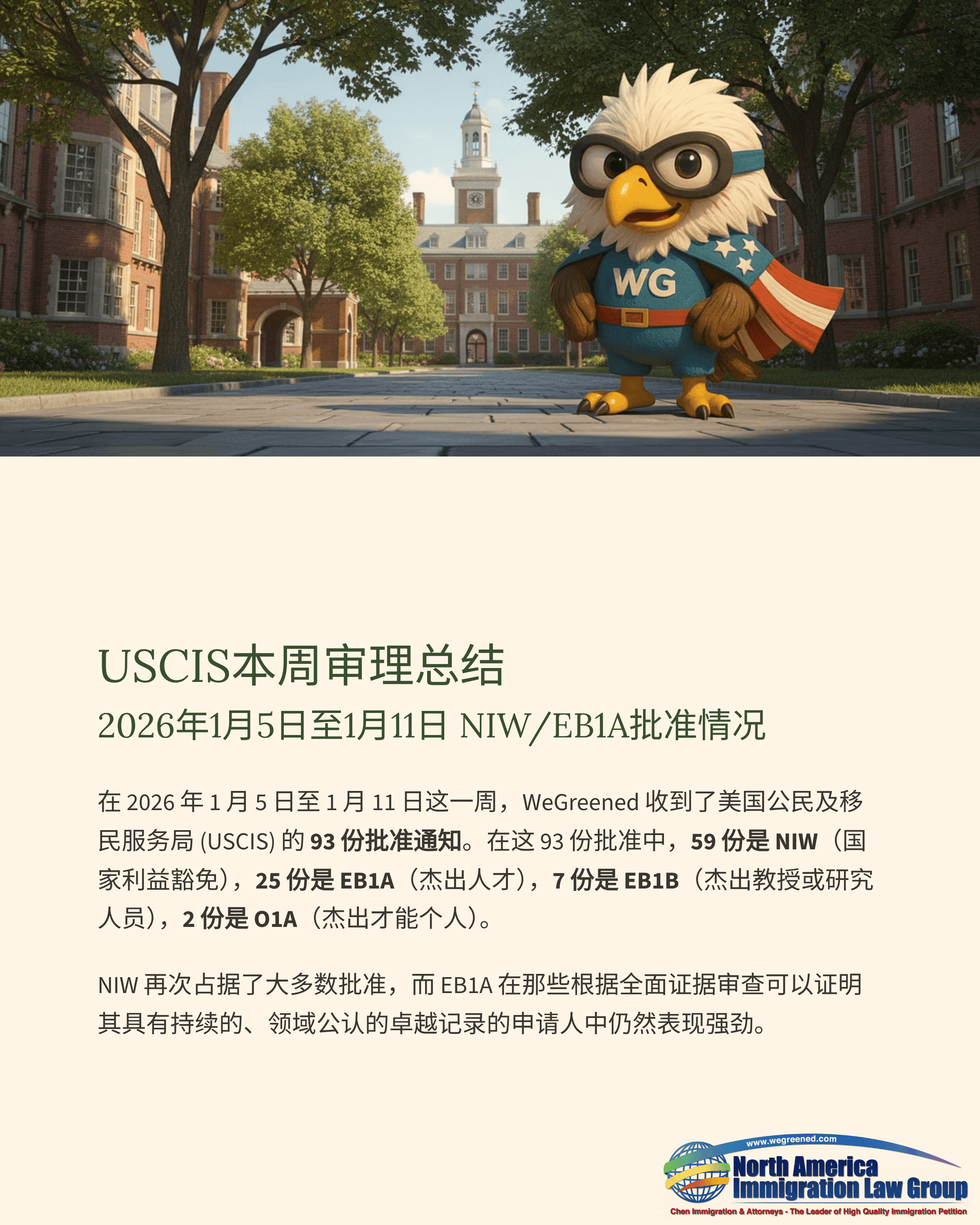 在2026年1月5日至2026年1月11日这一周内,WeGreened 共收到来自美国移民局(USCIS)的93份批准通知书。其中,NIW(国家利益豁免)59件、EB1A(杰出人才)25件、EB1B(杰出教授/研究人员)7件、O1A(杰出才能个人)2件。