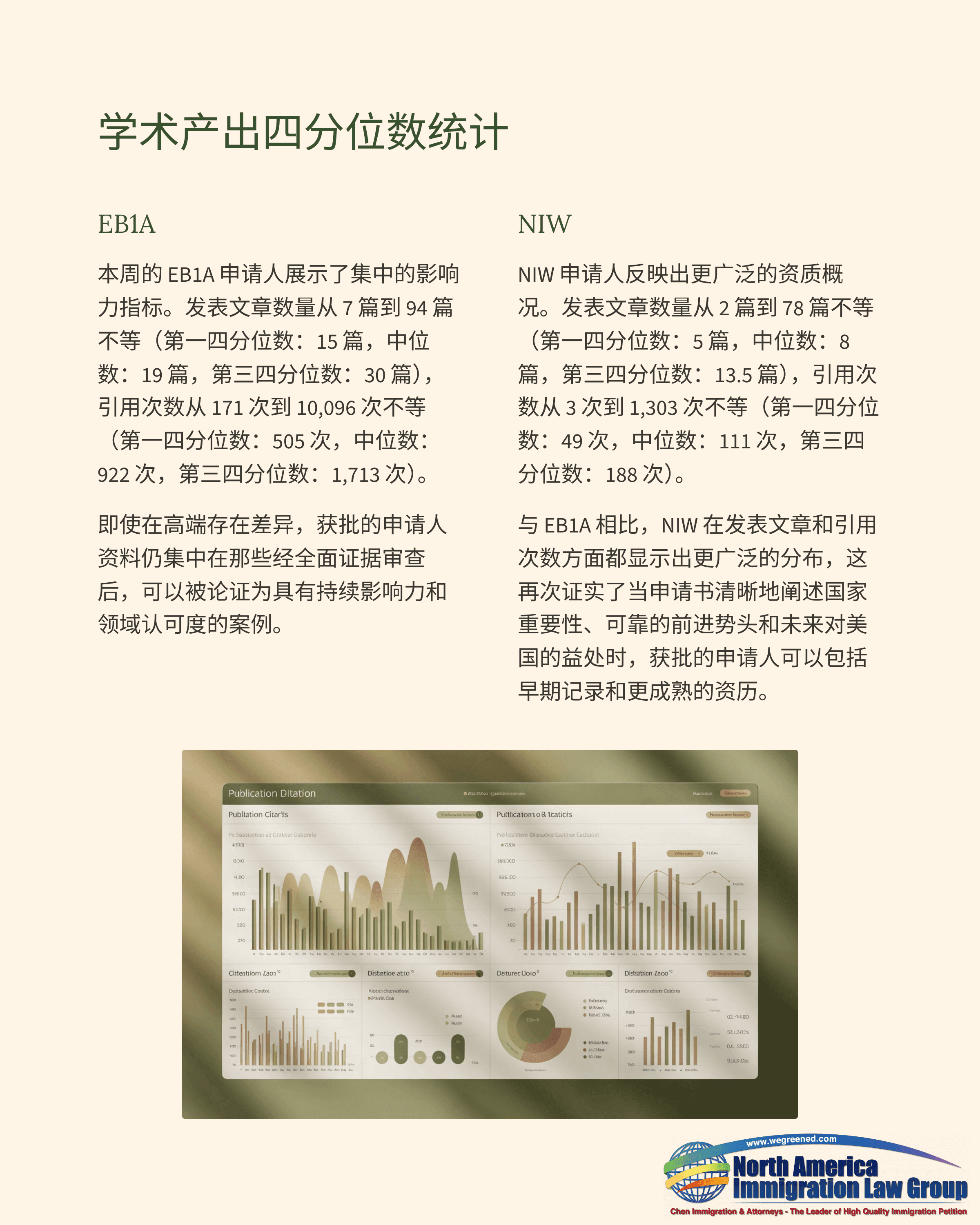 从分布来看,EB1A的指标整体更“集中”,即便高端有更强的数据点,获批案例仍多落在一个相对稳定的区间内,这也符合EB1A在最终综合评估中更强调持续影响与业内认可的特点。NIW在文章数与引用数上分布更宽,说明获批人群既包含相对早期的记录,也包含更成熟的学术记录;关键仍在于材料是否把国家重要性、推进逻辑和未来对美国的实际收益讲清楚、讲扎实。