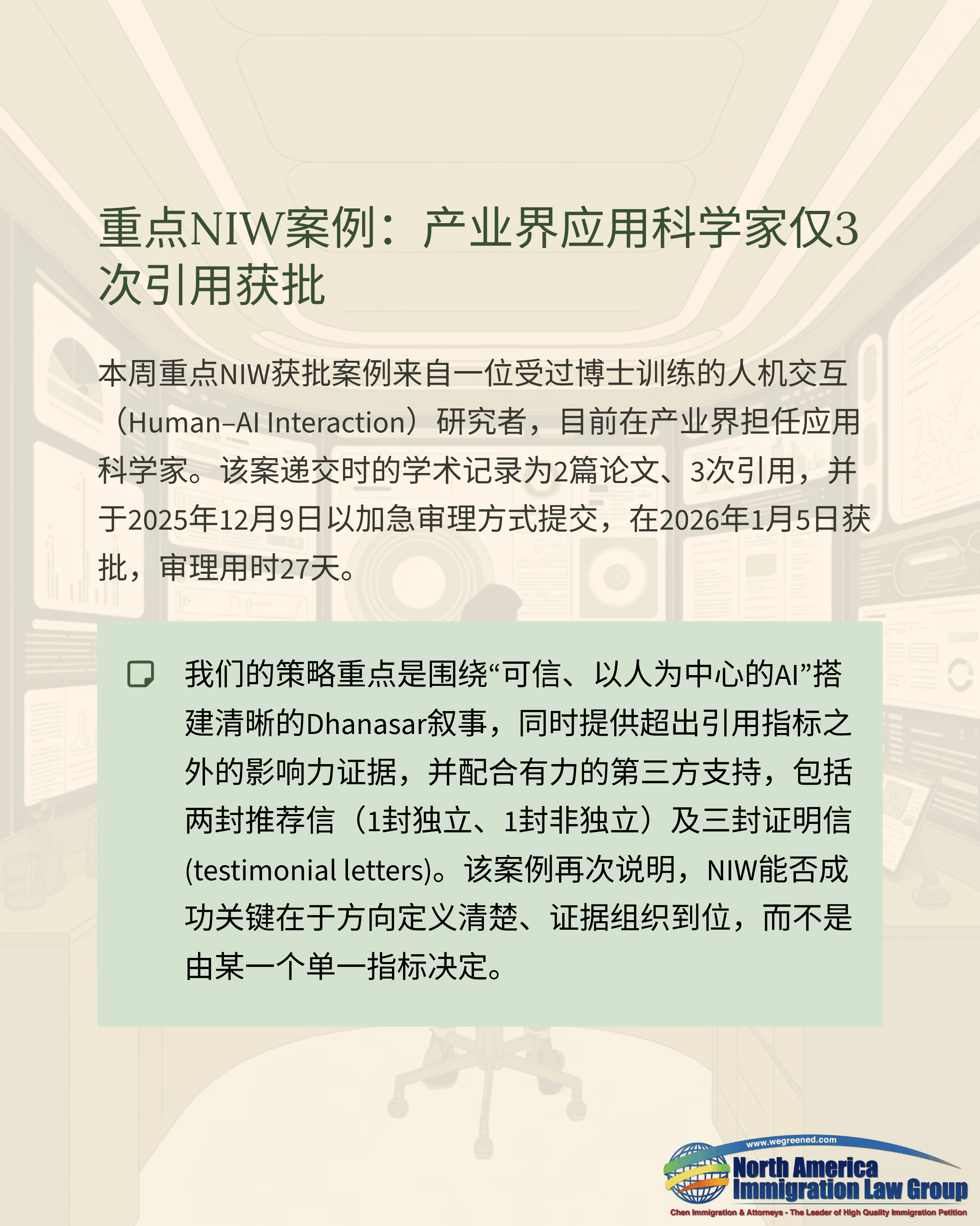 本周一例值得关注的NIW获批案例来自一位在产业界工作的应用科学家,研究背景为人机交互与人本AI方向,拥有博士训练。申请人聚焦构建“以人为中心”的AI框架,把行为科学融入AI与大语言模型设计中,以提升AI系统在真实场景中的表现与使用效果。该案递交时记录为2篇论文、3次引用。案件于2025年12月9日加急递交,并在2026年1月5日获批,审理用时27天。